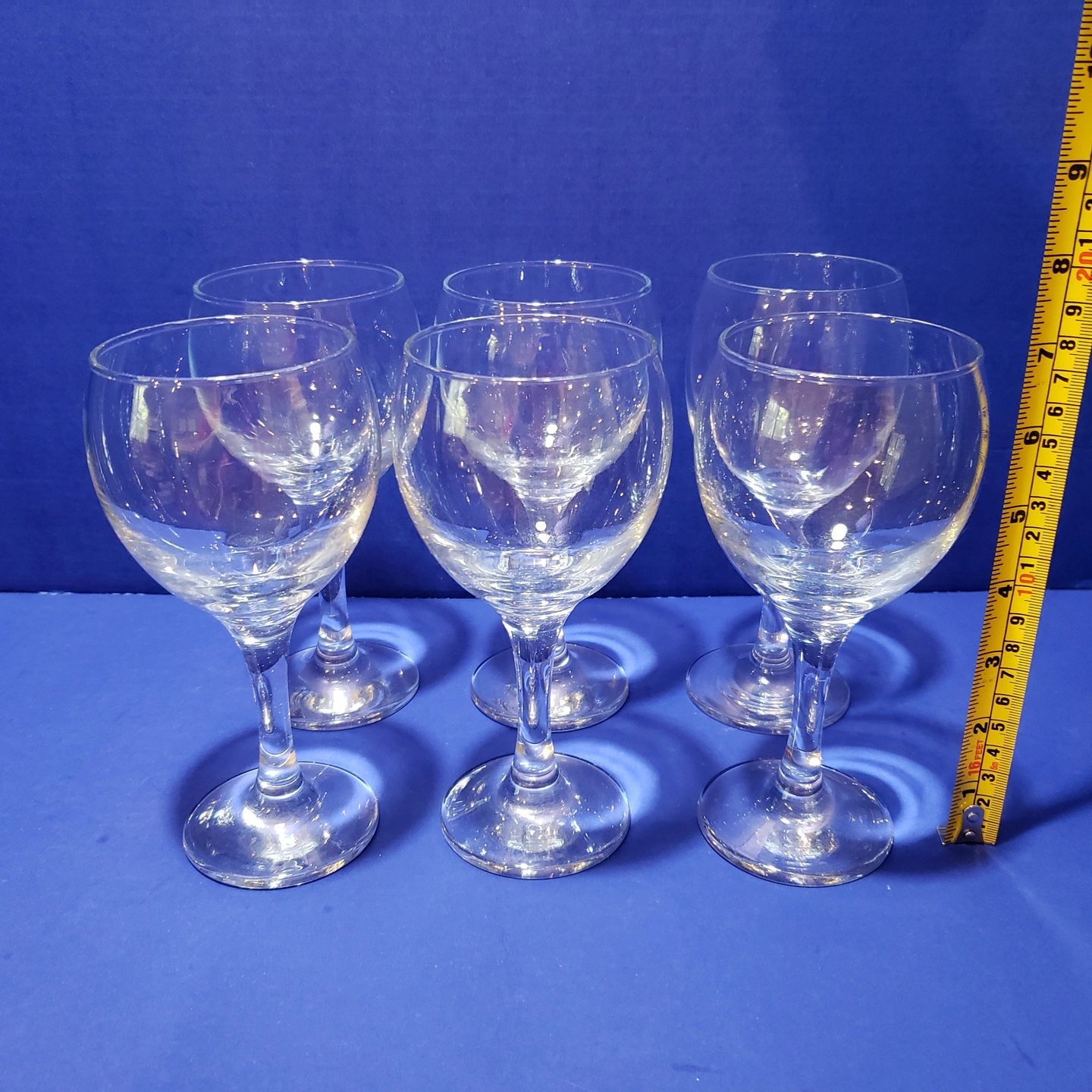 • Five wine glasses 7” tall, 3” diameter rim, 10 ounces capacity