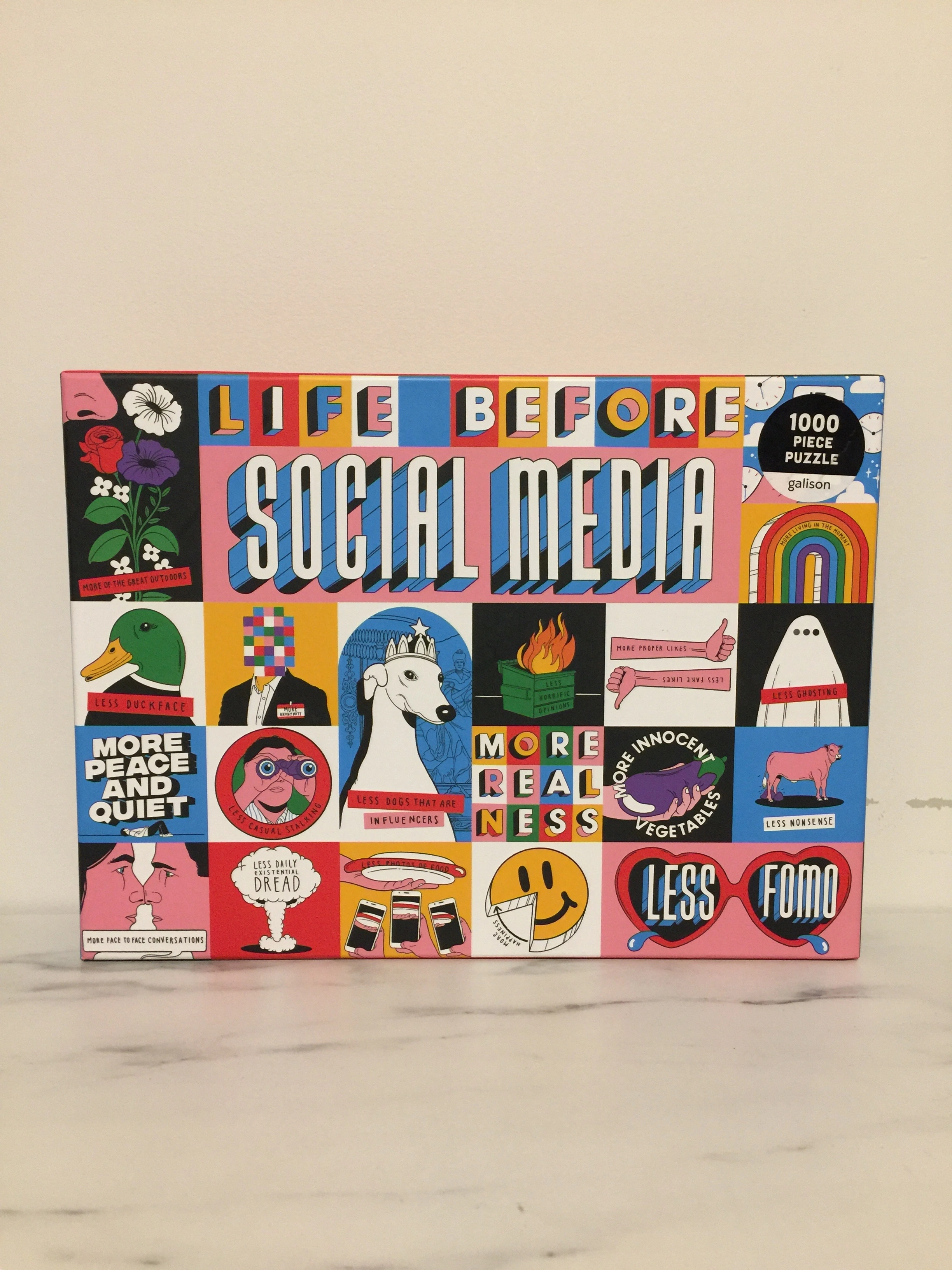 Looking to unplug and unwind? This Galison Life Before Social Media 1000-piece puzzle is perfect for a cozy night in. It's got a fun, colourful design that's sure to keep you entertained. The puzzle features a variety of quirky illustrations and phrases that poke fun at our digital habits. Get ready for some screen-free fun!