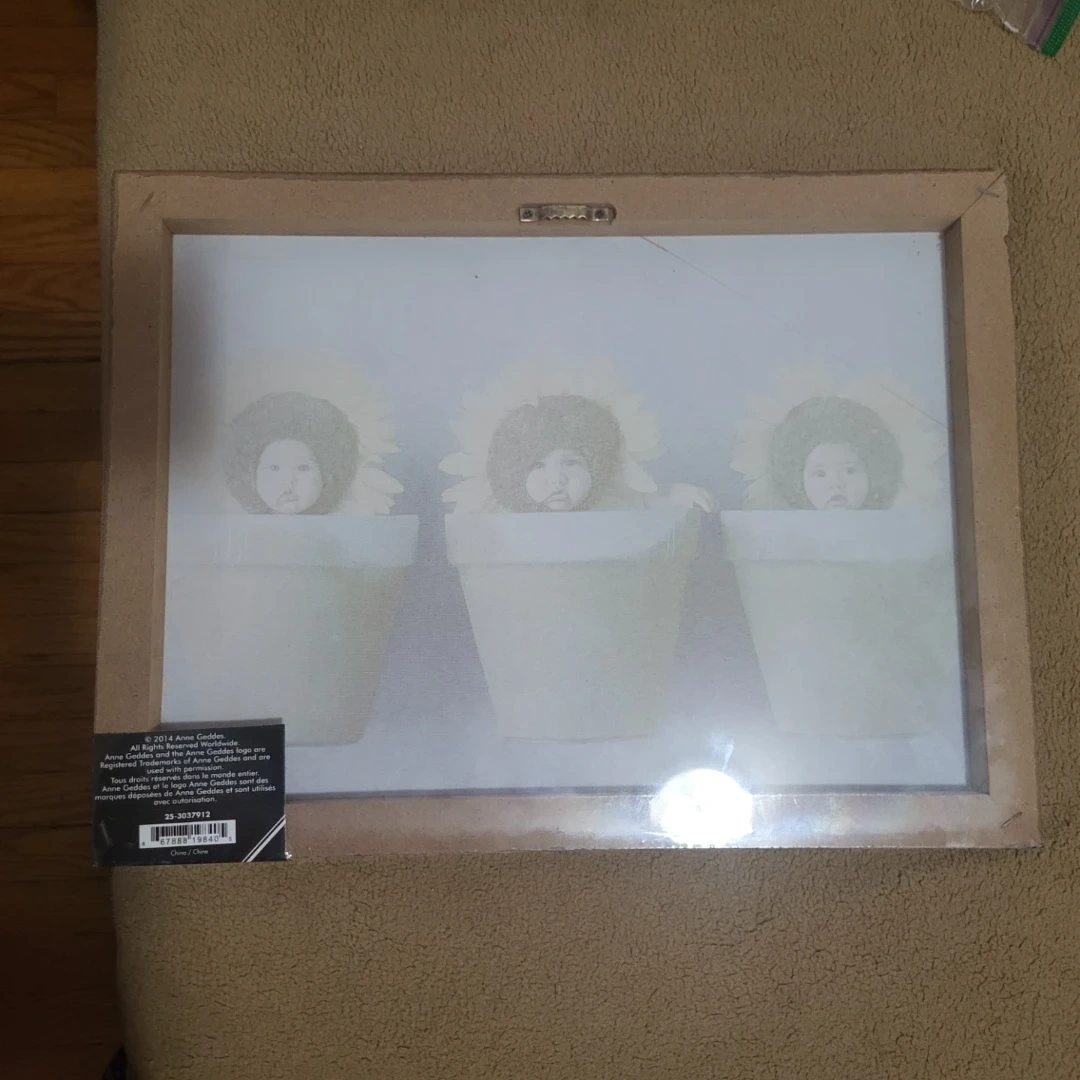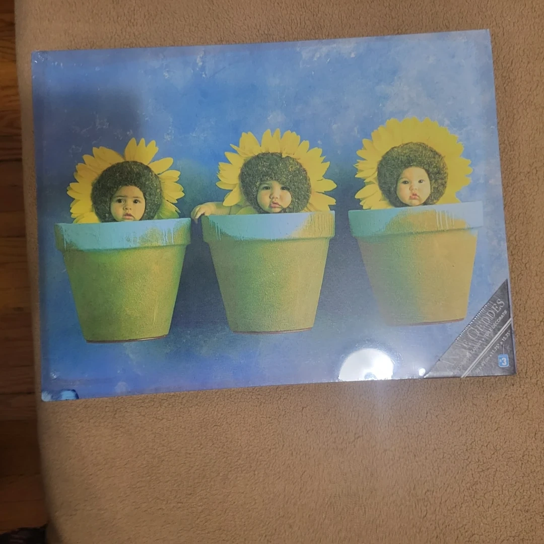 Here's a framed art print featuring a whimsical design of sunflower faces in pots. The print is in good condition and ready to add a touch of charm to your space. It measures 24 x 30 inches.