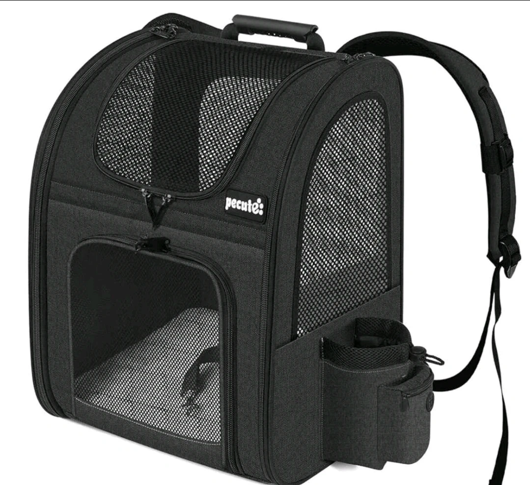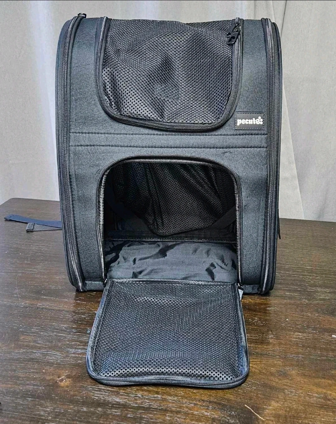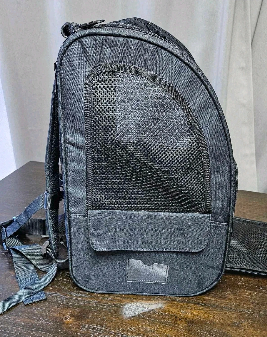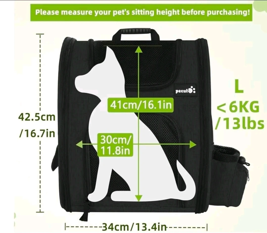 Looking to sell this Pecute pet carrier backpack in black, size L. It's designed to carry pets up to 13lbs (6KG). Features include a comfortable and breathable design with thickened shoulder straps and a waist buckle for added support. DimensionsApprox