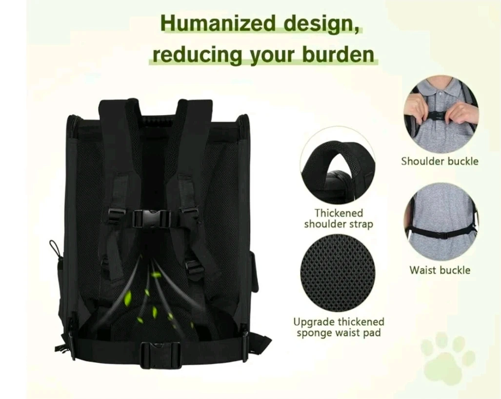 Looking to sell this Pecute pet carrier backpack in black, size L. It's designed to carry pets up to 13lbs (6KG). Features include a comfortable and breathable design with thickened shoulder straps and a waist buckle for added support. DimensionsApprox
