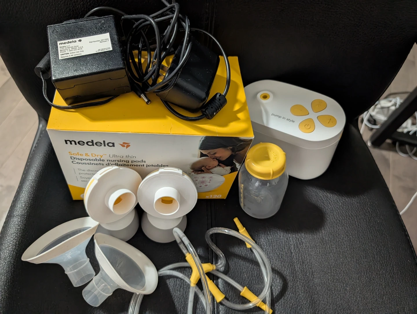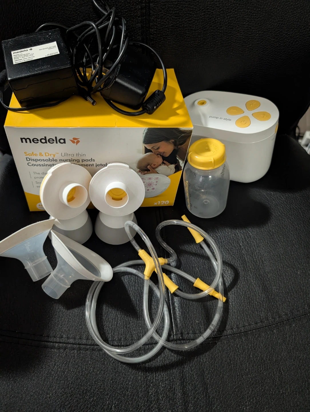 Selling a Medela Pump In Style breast pump. It comes with all the accessories you see in the photos, including the pump, flanges, bottles, tubing, and power adapter. The pump is in great condition and ready for a new home! Also includes a box of Medela Safe & Dry Ultra thin disposable nursing pads.