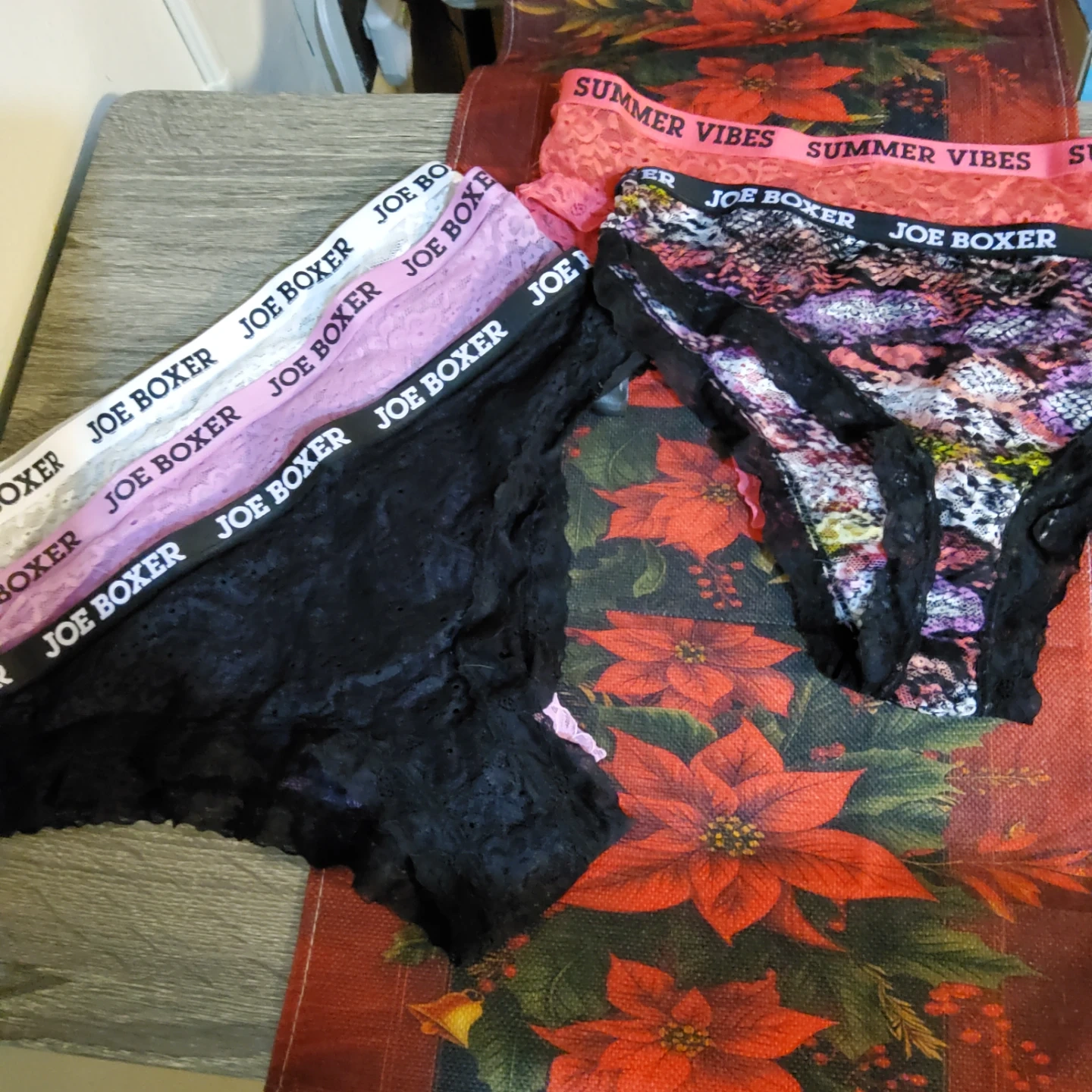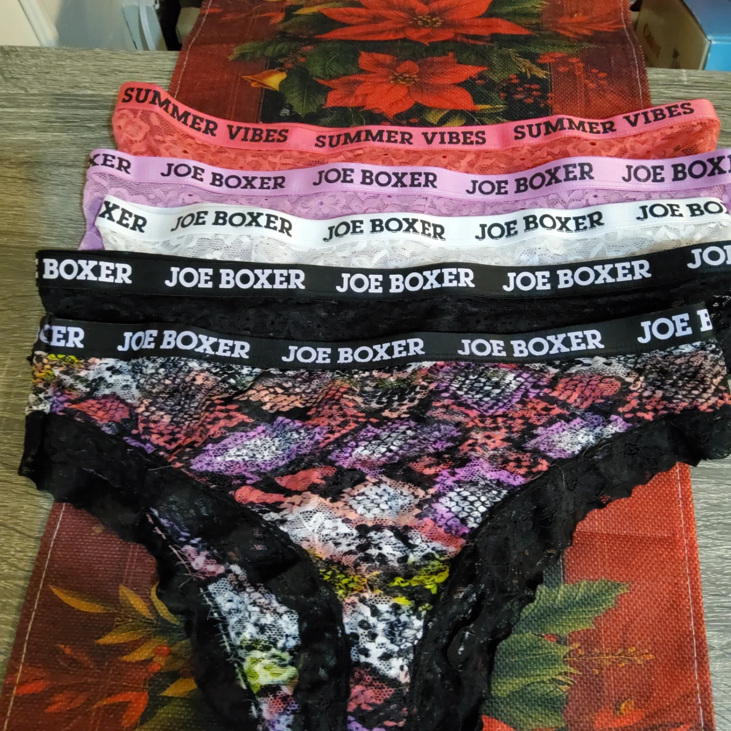 Selling a set of five Joe Boxer panties in size 1X. They come in various colors and designs, including lace and 'Summer Vibes' styles. Perfect for adding some variety to your wardrobe!