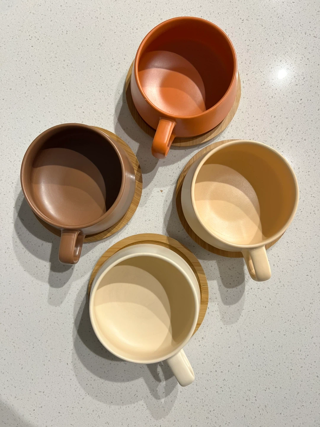 Selling this set of 4 ceramic cups with matching bamboo saucers/coasters. They are from the brand MIAMIO (Luxe Collection) in the "Beige Pastel" colorway (beautiful earth tones).
