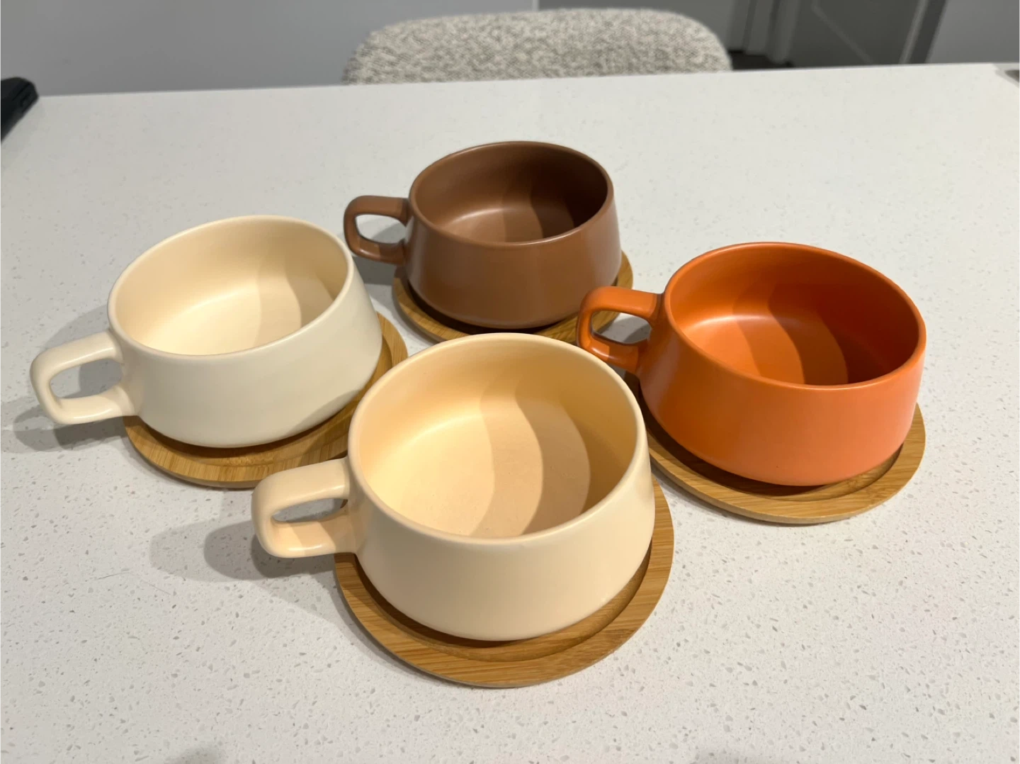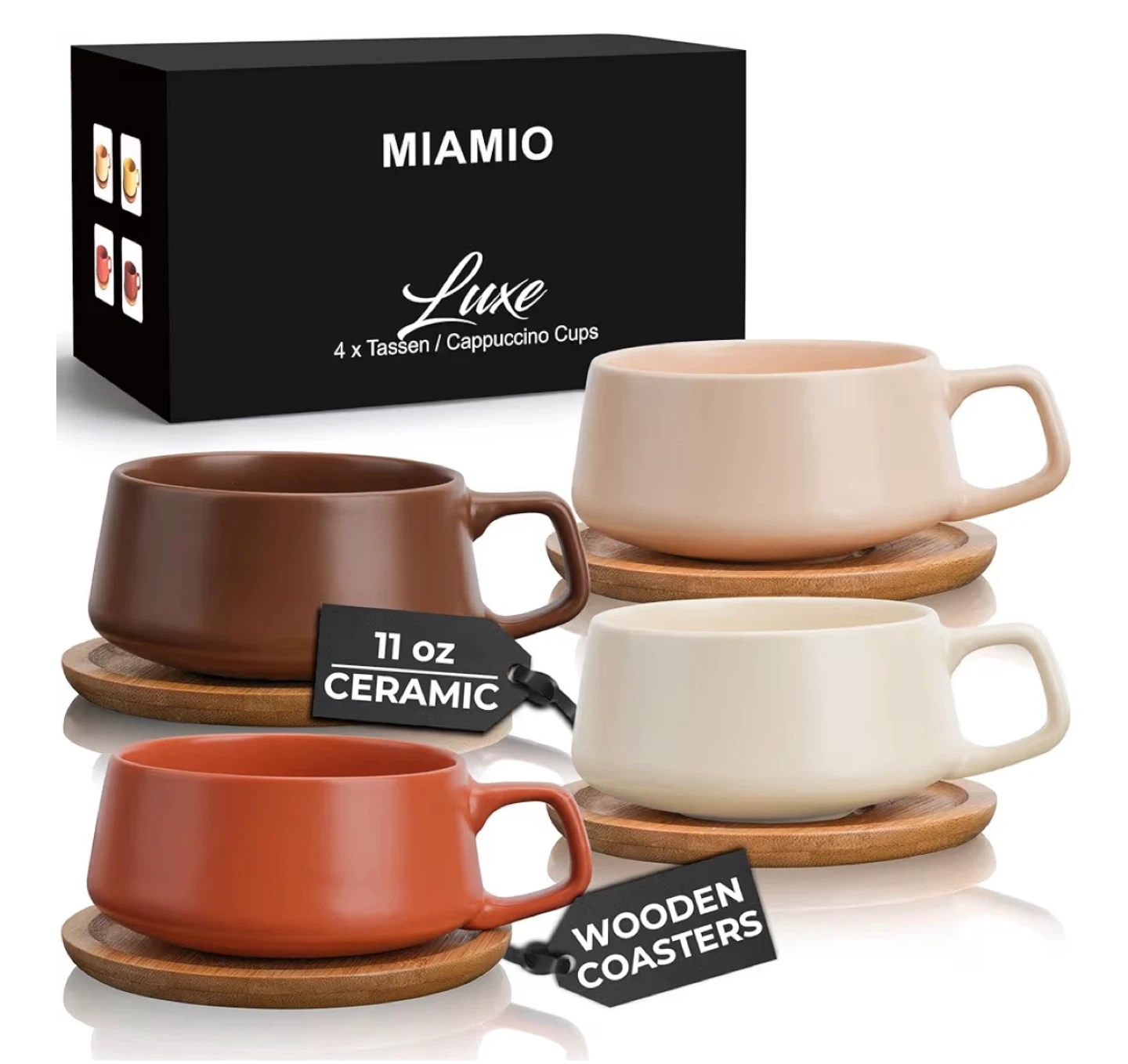 Selling this set of 4 ceramic cups with matching bamboo saucers/coasters. They are from the brand MIAMIO (Luxe Collection) in the "Beige Pastel" colorway (beautiful earth tones).