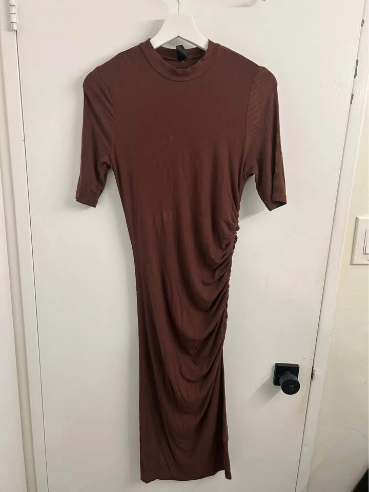 Mini dark brown dress, buttoned down with ruching and long sleeves. Size L (fits a medium, stretchy).