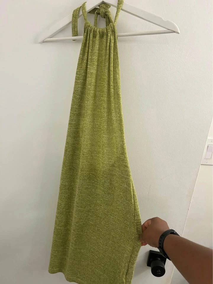 Mini lime green dress, backless, ties around the neck, stretchy material. Size L.