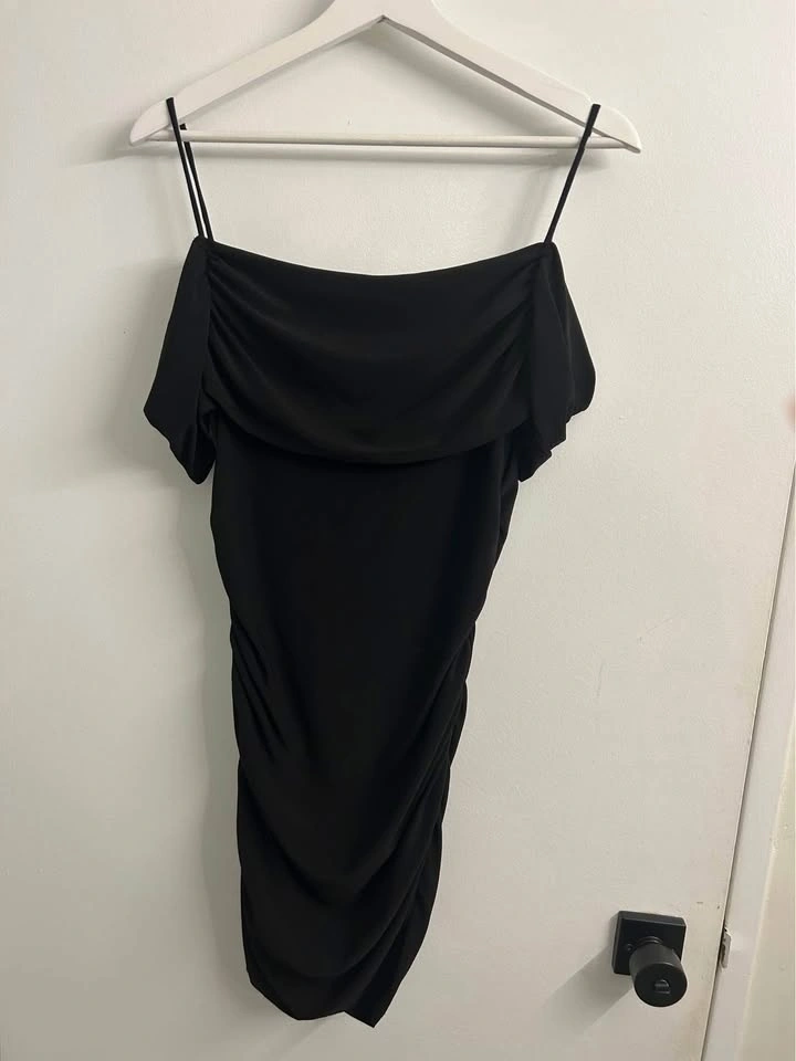 Mini black dress, can be worn off the shoulder or higher up. Size M.
