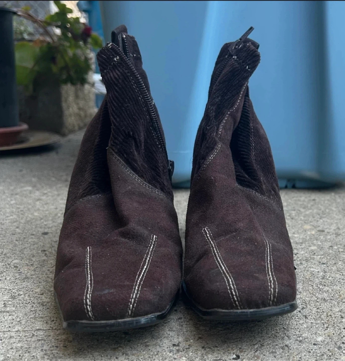 Selling a pair of brown ankle boots. They have a suede-like texture and a zipper on the side. Great for fall!