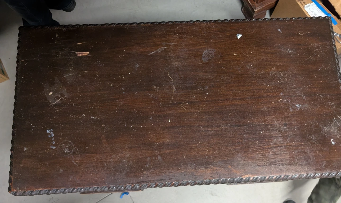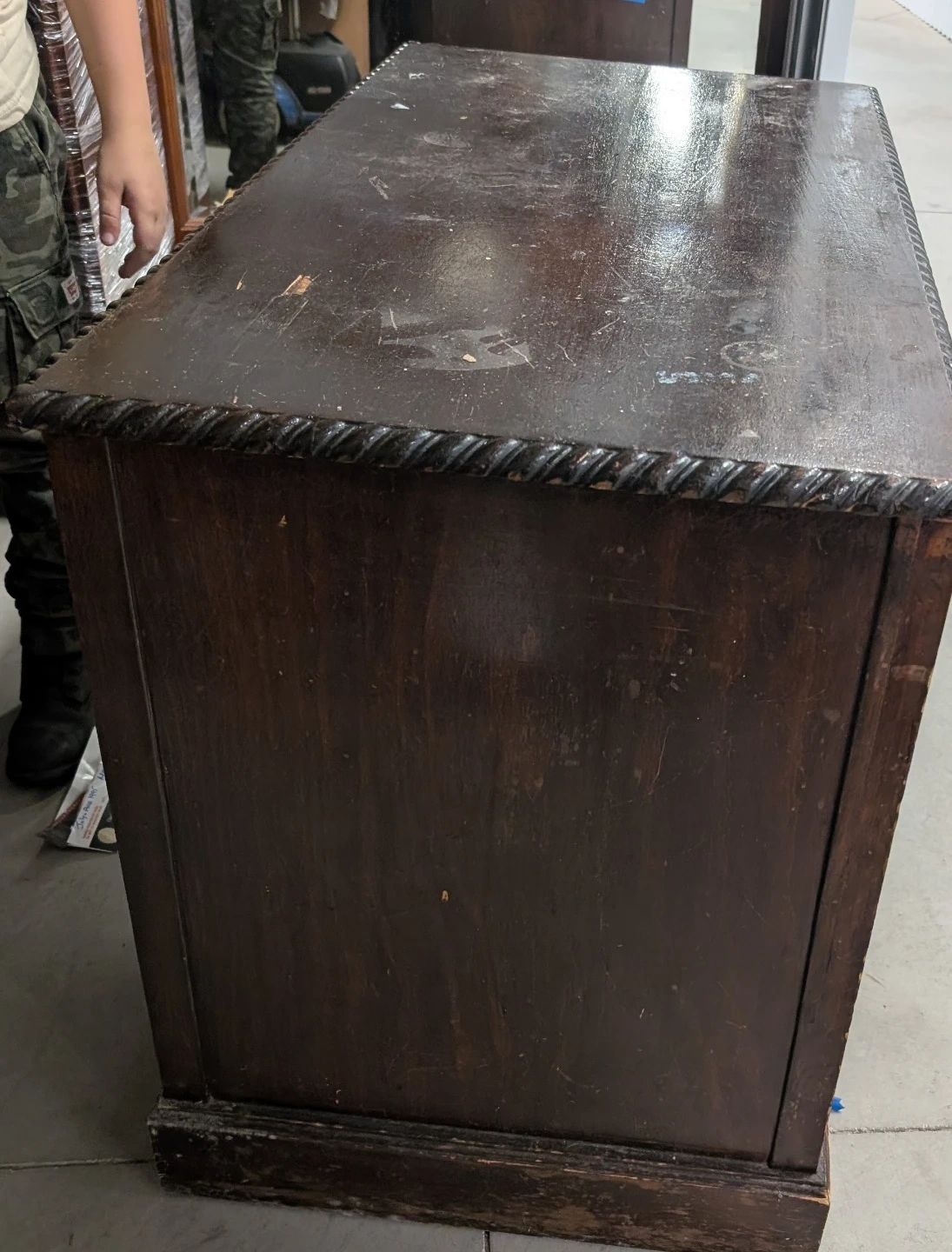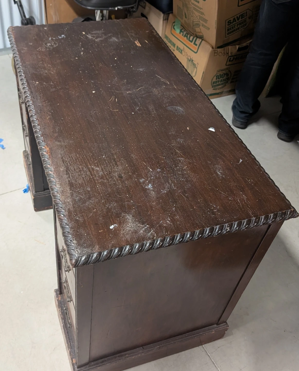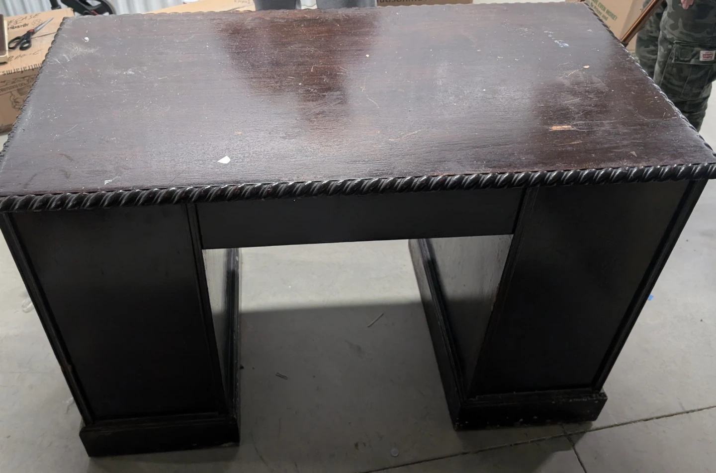 Selling a vintage dark wood desk. It has a classic look with multiple drawers for storage. It does show signs of wear, but it's still a solid piece of furniture