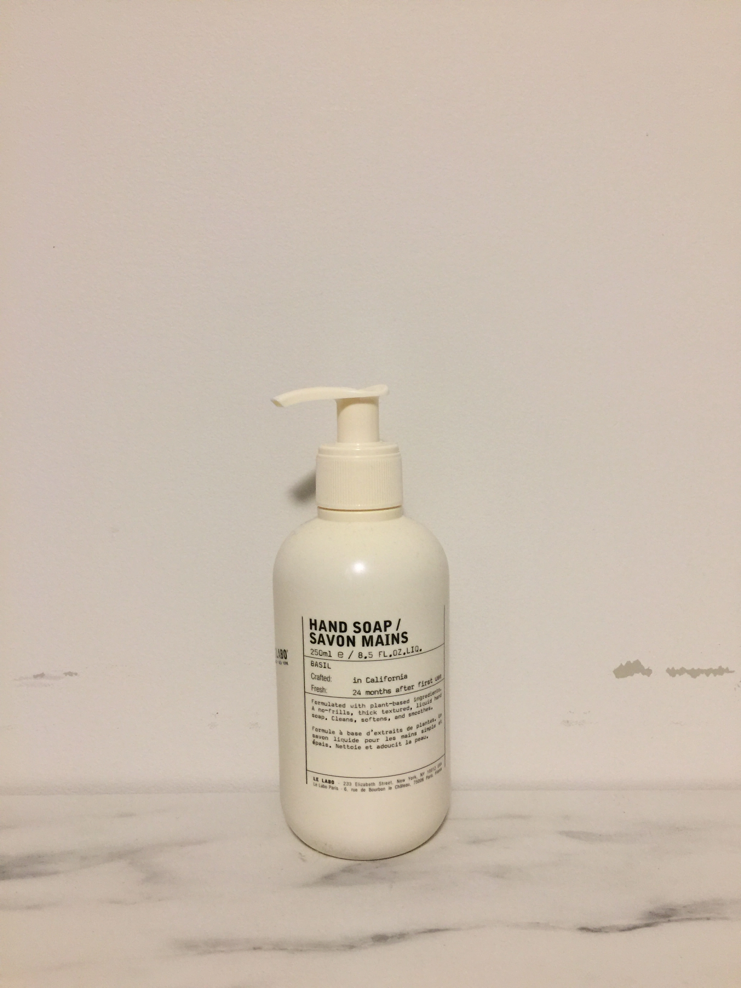 Selling a bottle of Le Labo Basil hand soap. It's a 250ml bottle, and the label says it's crafted in California. This hand soap is formulated with plant-based ingredients, leaving your hands clean, soft, and smooth. It's a thick-textured liquid soap, perfect for everyday use