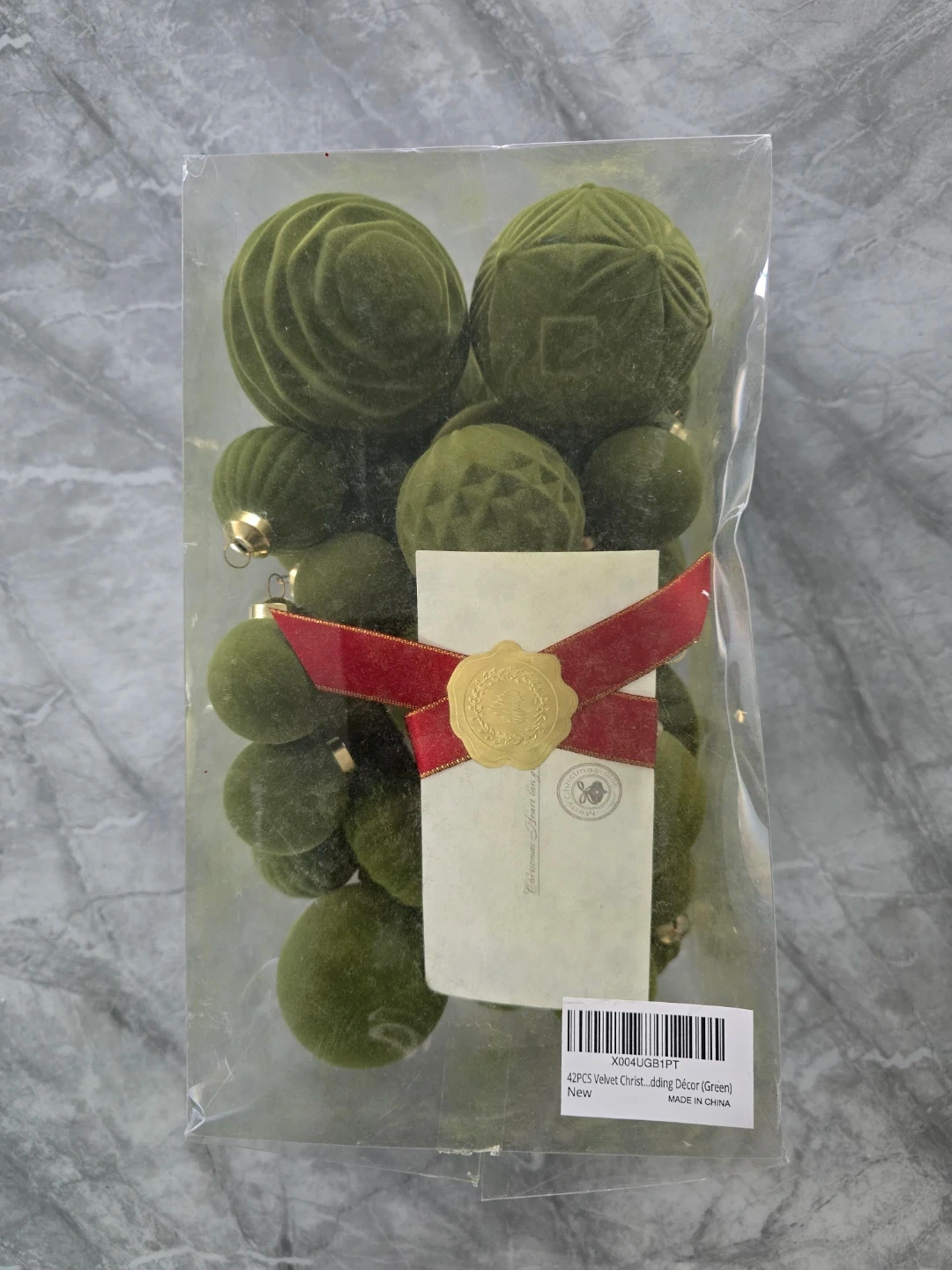 These are brand new, still in the box! This set includes 40 pieces of velvet corded balling décor in a beautiful green colour. Perfect for adding a touch of elegance to your holiday decorations