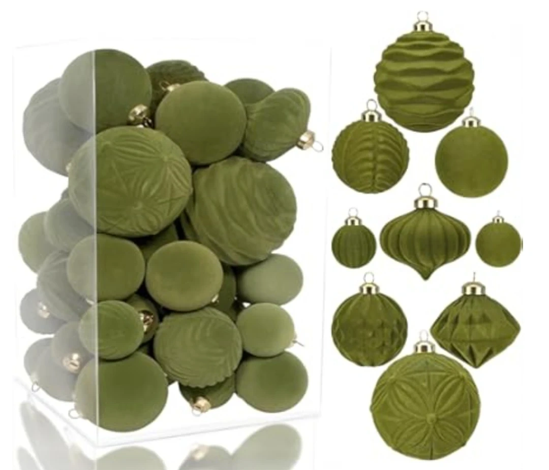 40Pcs Green Velvet Christmas Ornaments Set, Assorted Flocked Christmas Baubles Decorations, Shatterproof Christmas Balls Hanging Decor for Xmas Tree/Home/Party/Holiday (Green)