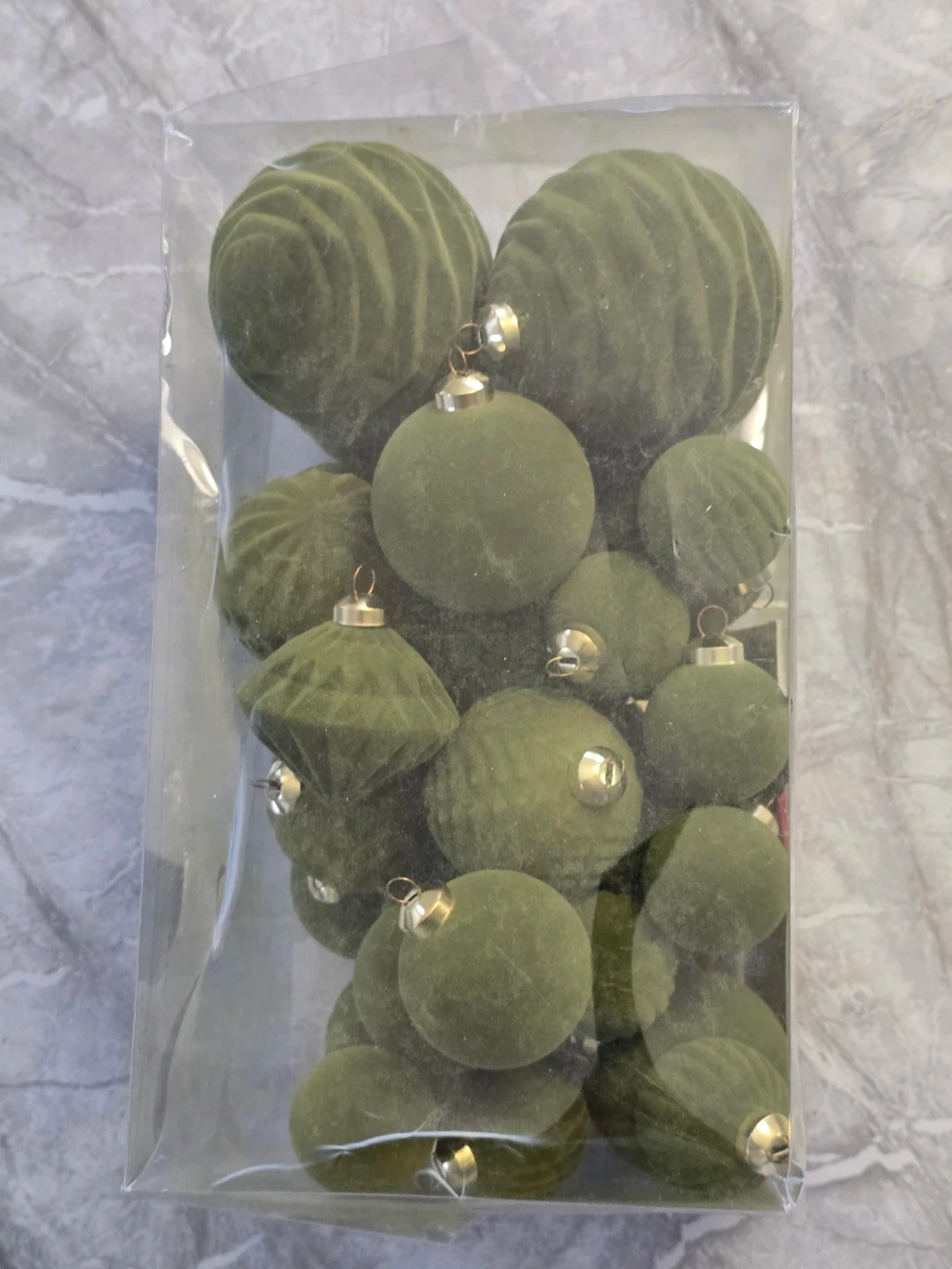 These are brand new, still in the box! This set includes 40 pieces of velvet corded balling décor in a beautiful green colour. Perfect for adding a touch of elegance to your holiday decorations