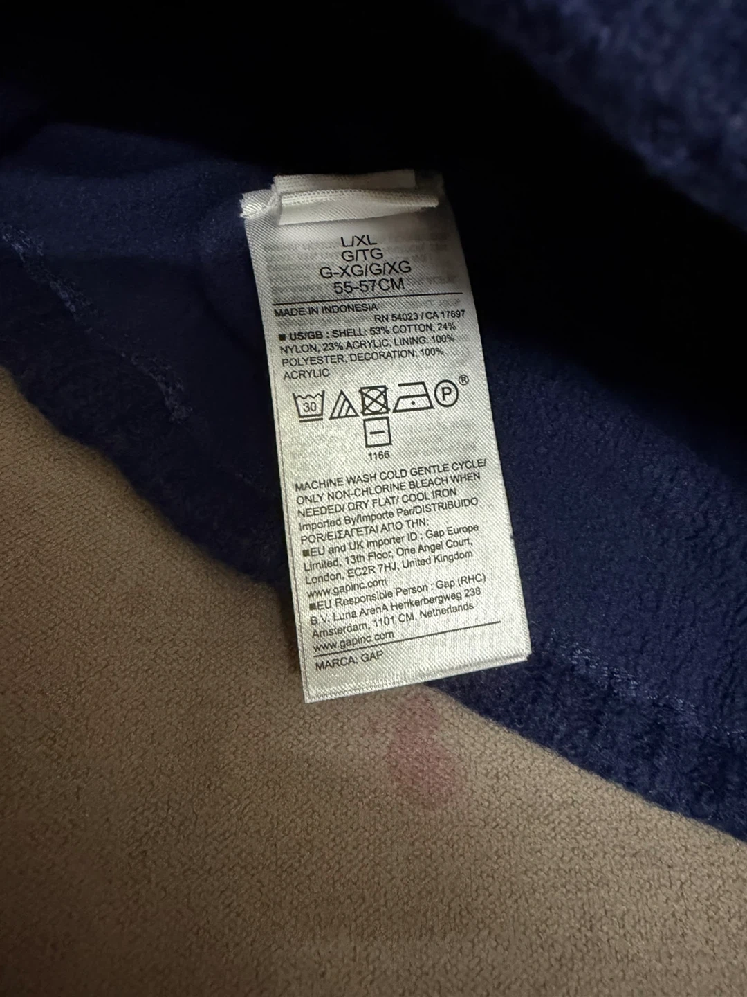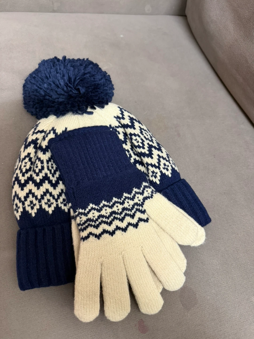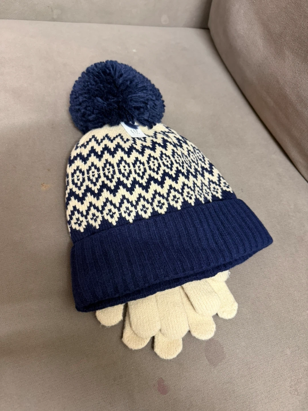Keep cozy with this Gap beanie and glove set! The hat has a fun pom pom on top and a stylish pattern. The gloves are a matching colour. Size L/XL. Originally bought for $64.95!
