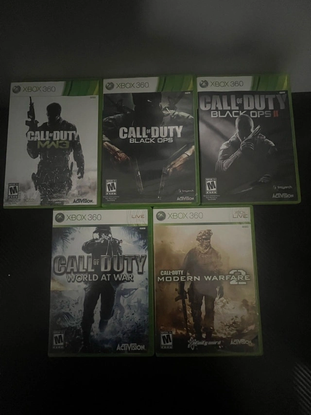 Selling a collection of Call of Duty games for the Xbox 360, including Modern Warfare 2, World at War, Black Ops, Black Ops II, and MW3. All games are in good condition and come with their cases and manuals. Asking $80 OBO for all 5.