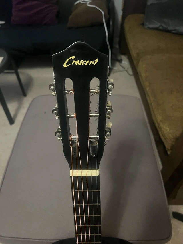 This Crescent guitar is a sleek, black acoustic instrument, perfect for beginners. It's in used, but good condition, ready to strum right out of the included case. Comes with a beginner lesson book. Brand: Crescent, Type: Acoustic Guitar, Colour: Black, Includes: Case, Beginner Lesson Book. Asking $120 obo. Willing to trade for gaming consoles, games, and/or accessories of equal value.