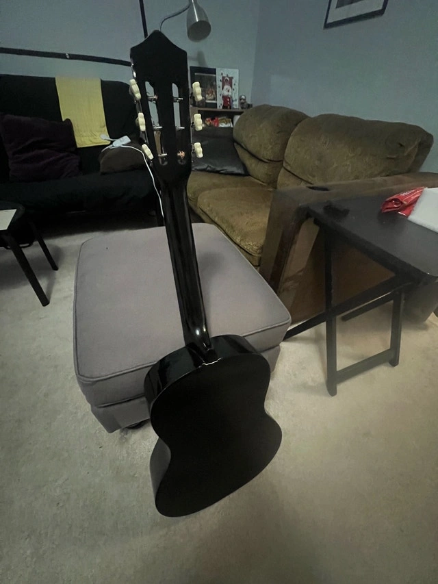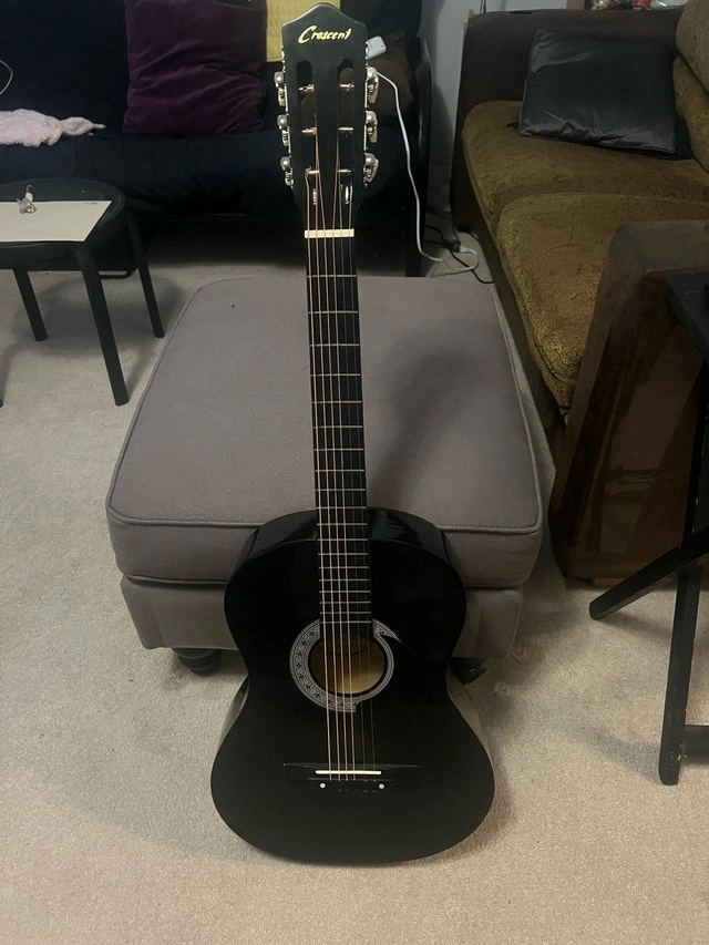 This Crescent guitar is a sleek, black acoustic instrument, perfect for beginners. It's in used, but good condition, ready to strum right out of the included case. Comes with a beginner lesson book. Brand: Crescent, Type: Acoustic Guitar, Colour: Black, Includes: Case, Beginner Lesson Book. Asking $120 obo. Willing to trade for gaming consoles, games, and/or accessories of equal value.