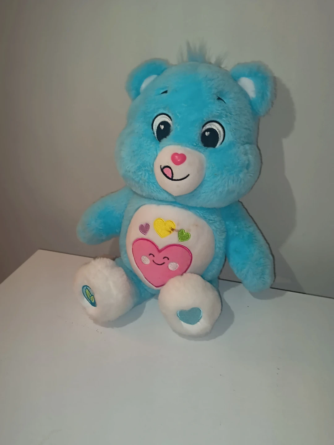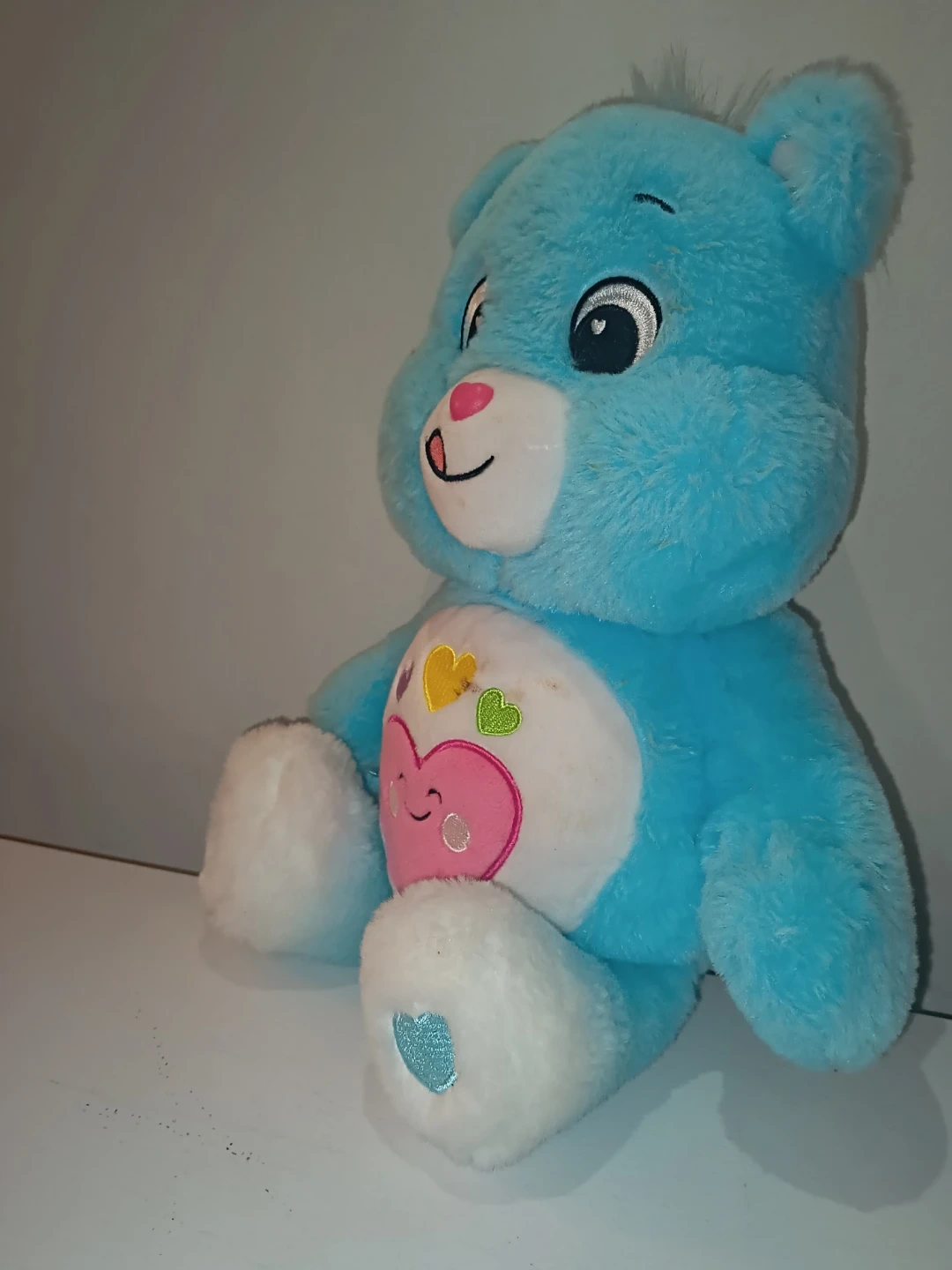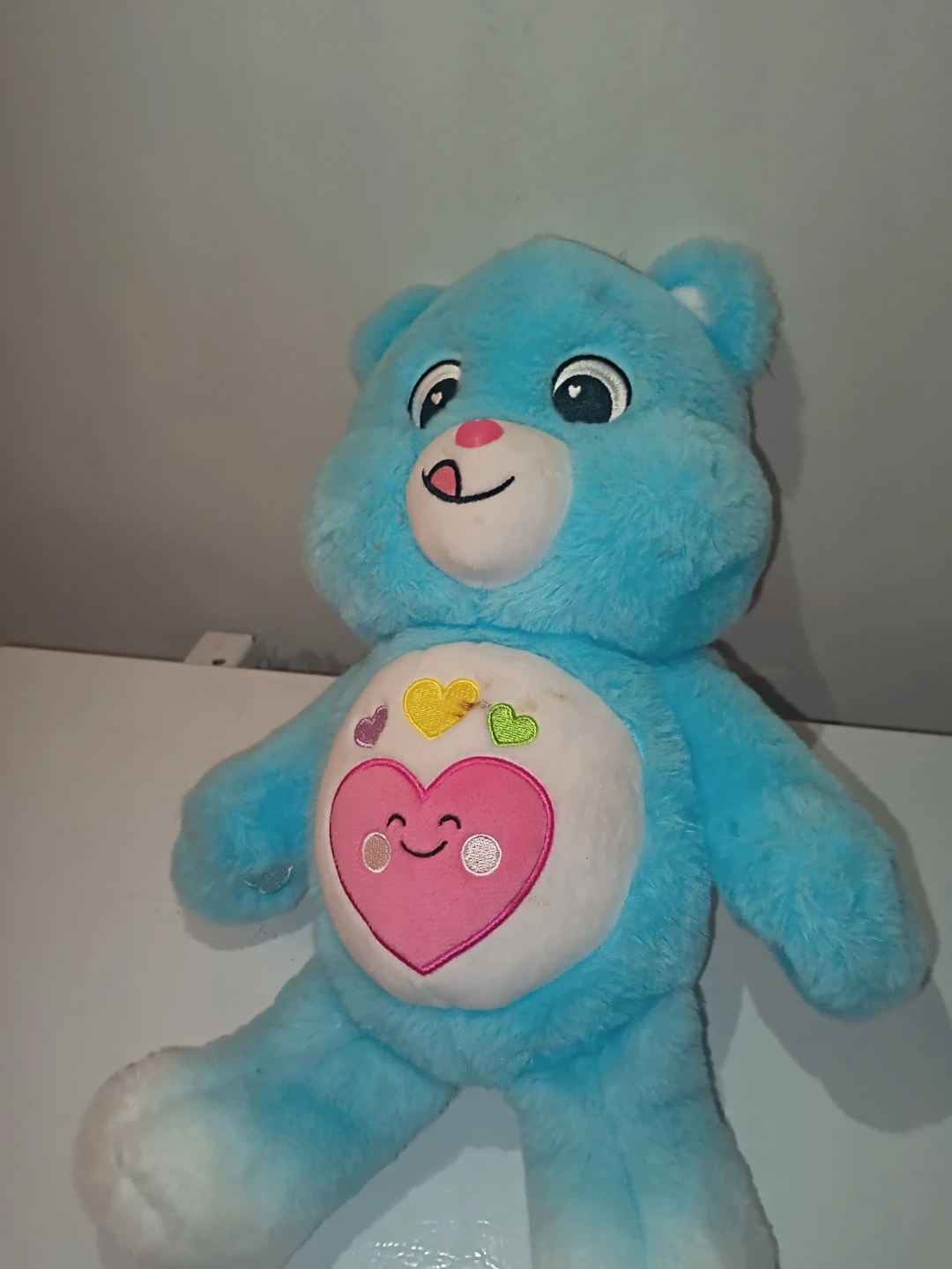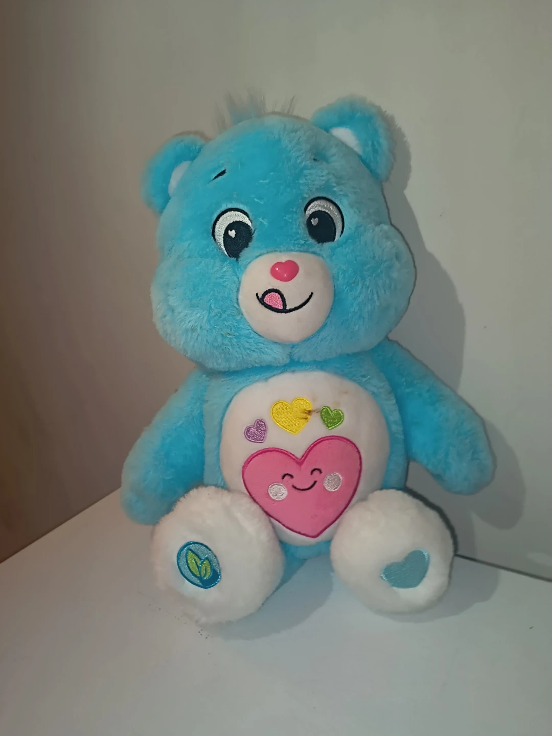 Selling a cute Care Bears plush toy! It's in great condition and ready for a new home. This plush is turquoise and features a heart on its tummy. It's soft and cuddly, perfect for kids or collectors!