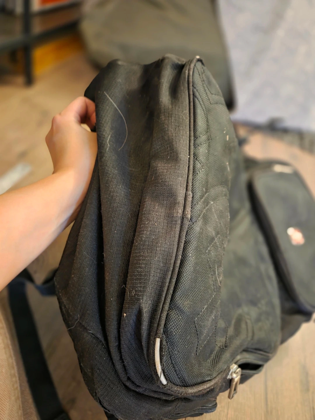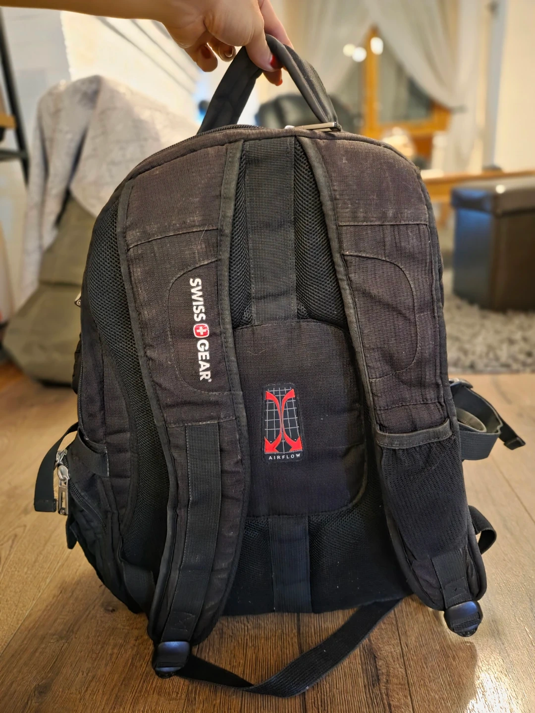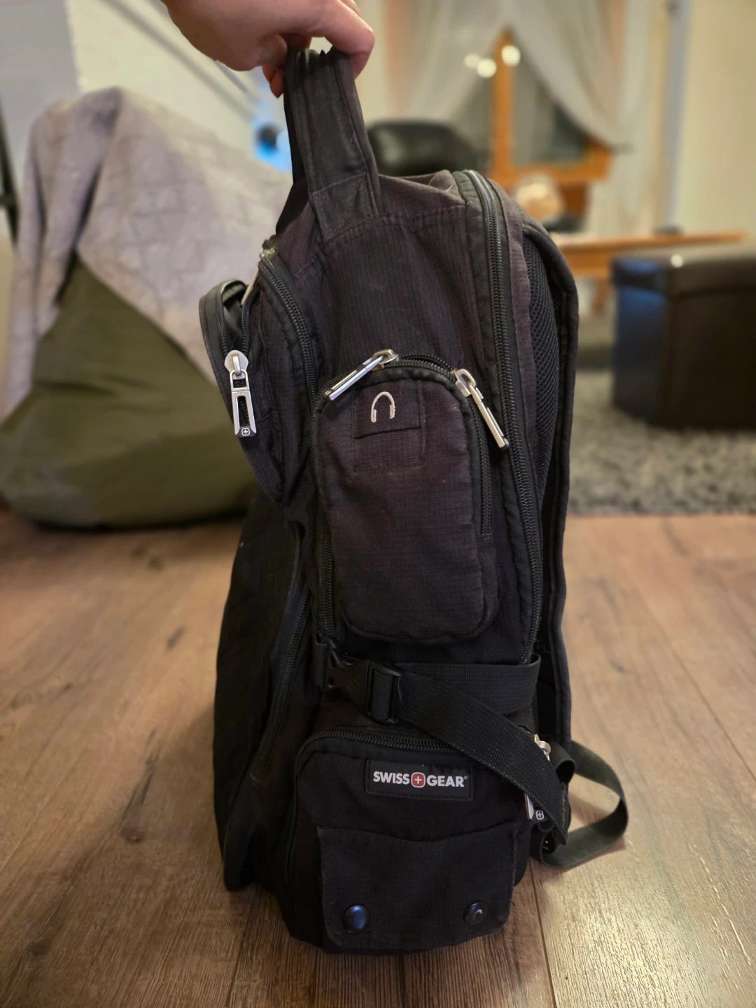 Selling a used black Swiss Gear backpack. It's in good condition, aside from a bit of wear on the front corners (pictured in last image) and has lots of pockets and compartments for storage. Perfect for school, work, or travel! Zippers and buckles all in good shape. Just needs a little wipe down.