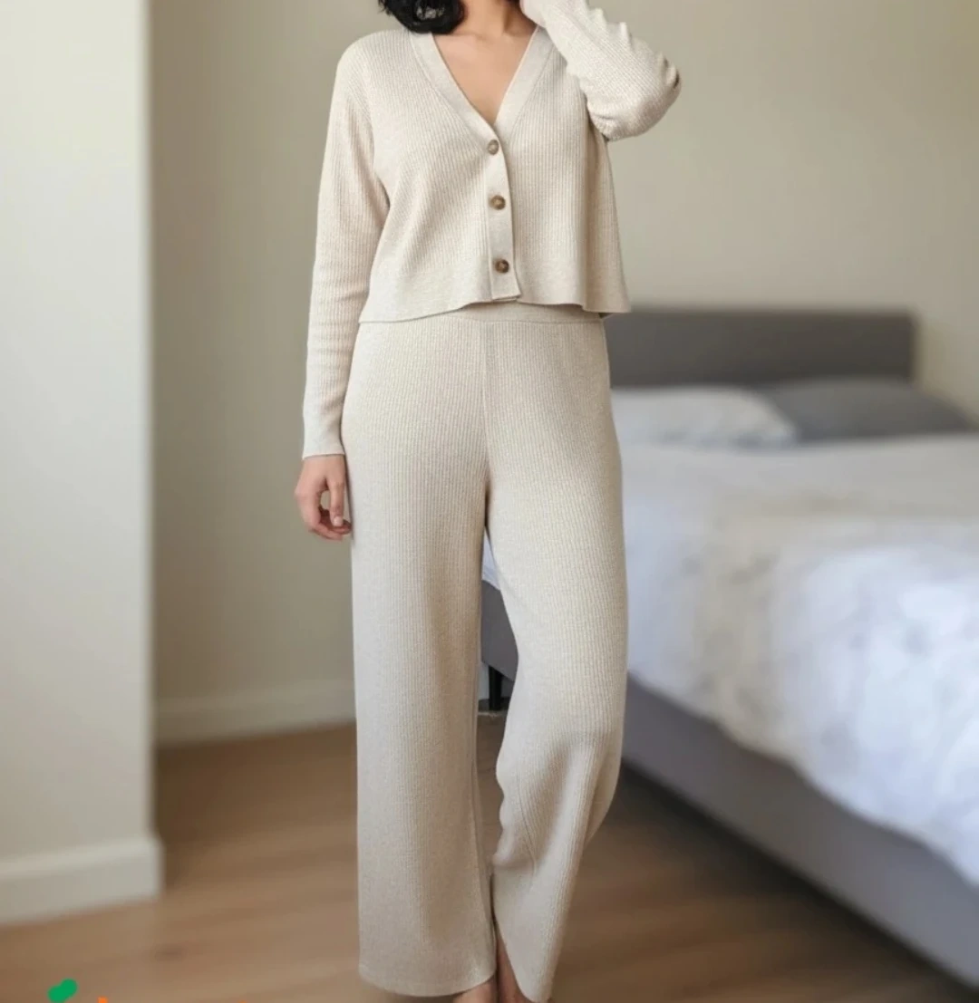 Selling a comfy beige knit lounge set! This set includes a cardigan and wide-leg pants. Perfect for relaxing at home or a casual outing. The material is soft and cozy, making it ideal for cooler weather