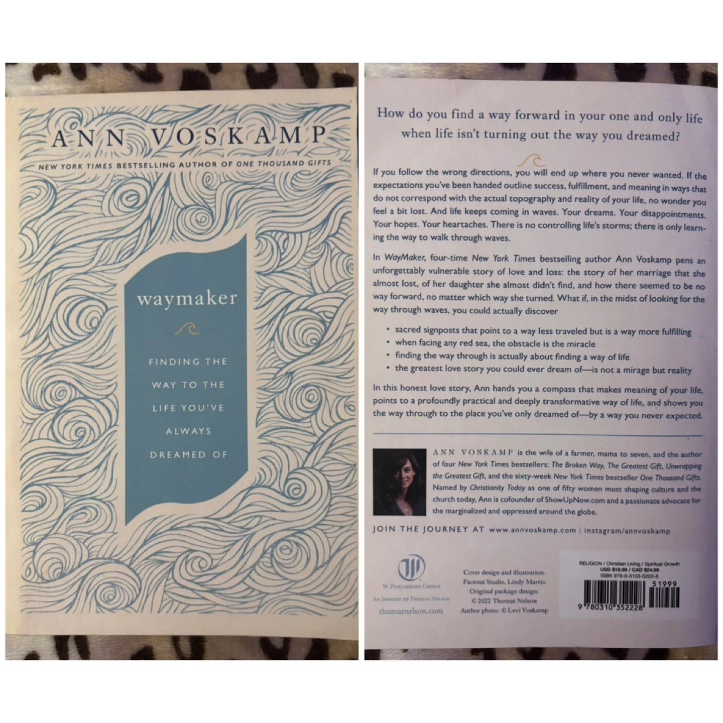 For sale is a copy of "WayMaker" by Ann Voskamp. It's a New York Times bestseller and explores themes of love, loss, and finding meaning in life. The cover design is really beautiful with a wave motif! Retails for $24.99 CAD.