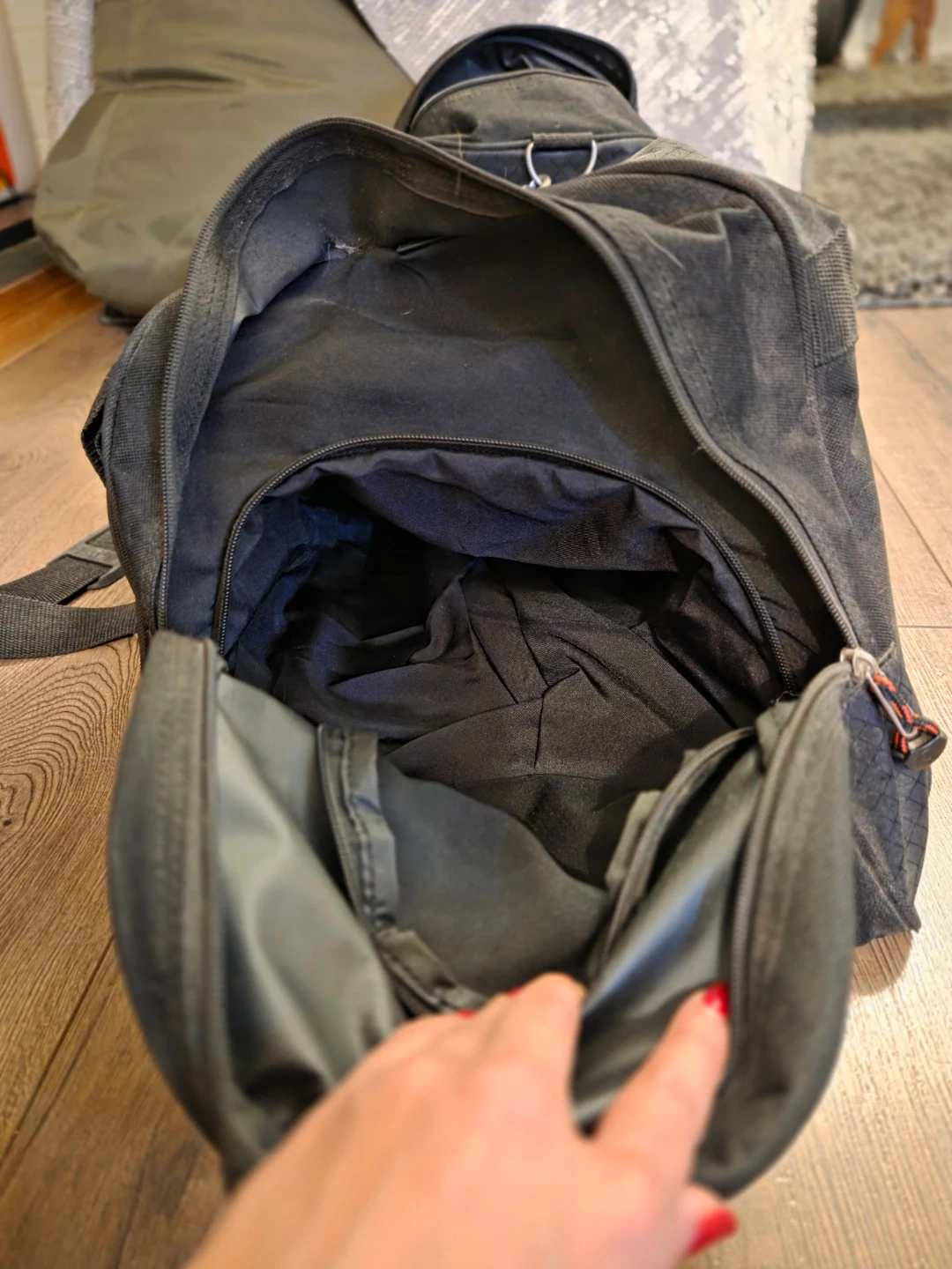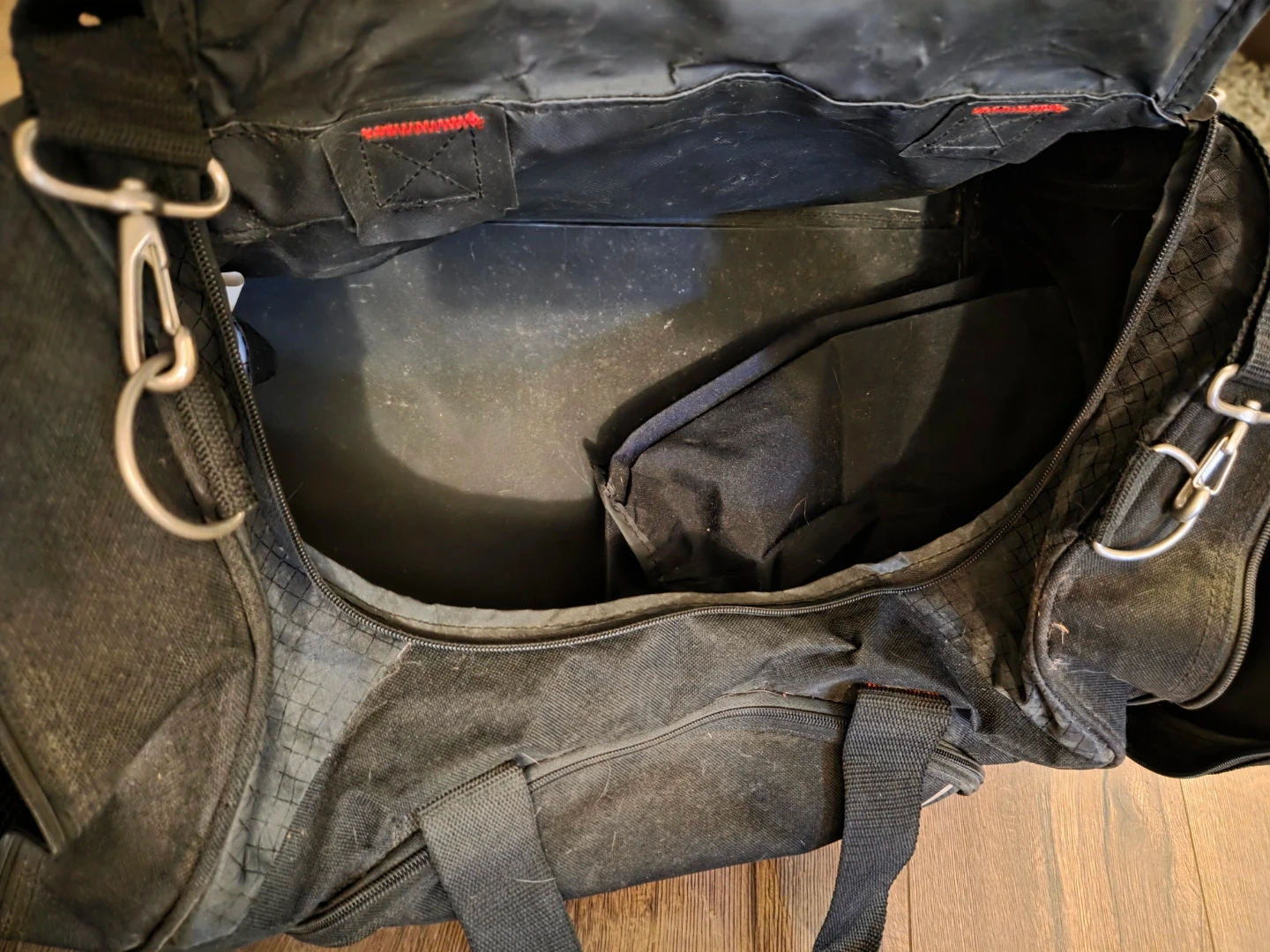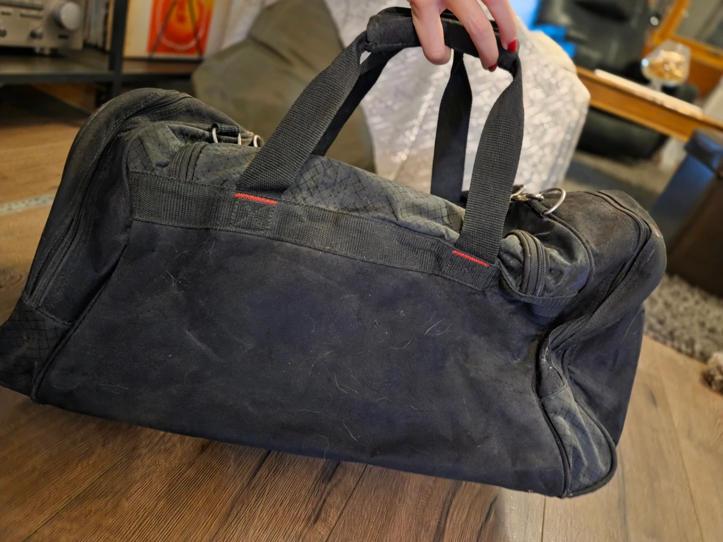 Selling a black gear / gym bag. It's in used condition, a bit dusty, but still has lots of life left. Great for sports or travel! Has a shoe compartment. Good handles and shoulder strap. Zippers work well.