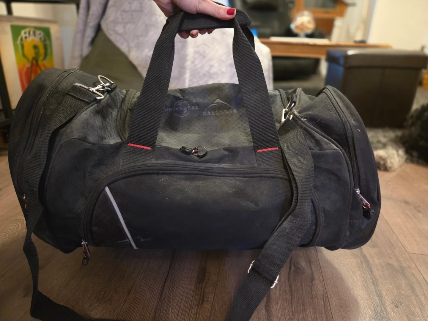 Selling a black gear / gym bag. It's in used condition, a bit dusty, but still has lots of life left. Great for sports or travel! Has a shoe compartment. Good handles and shoulder strap. Zippers work well.