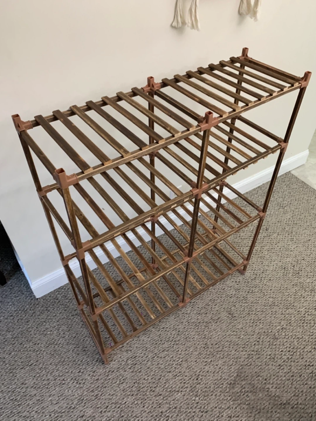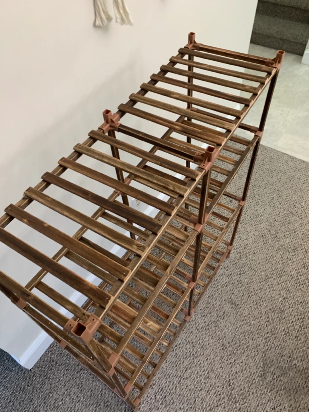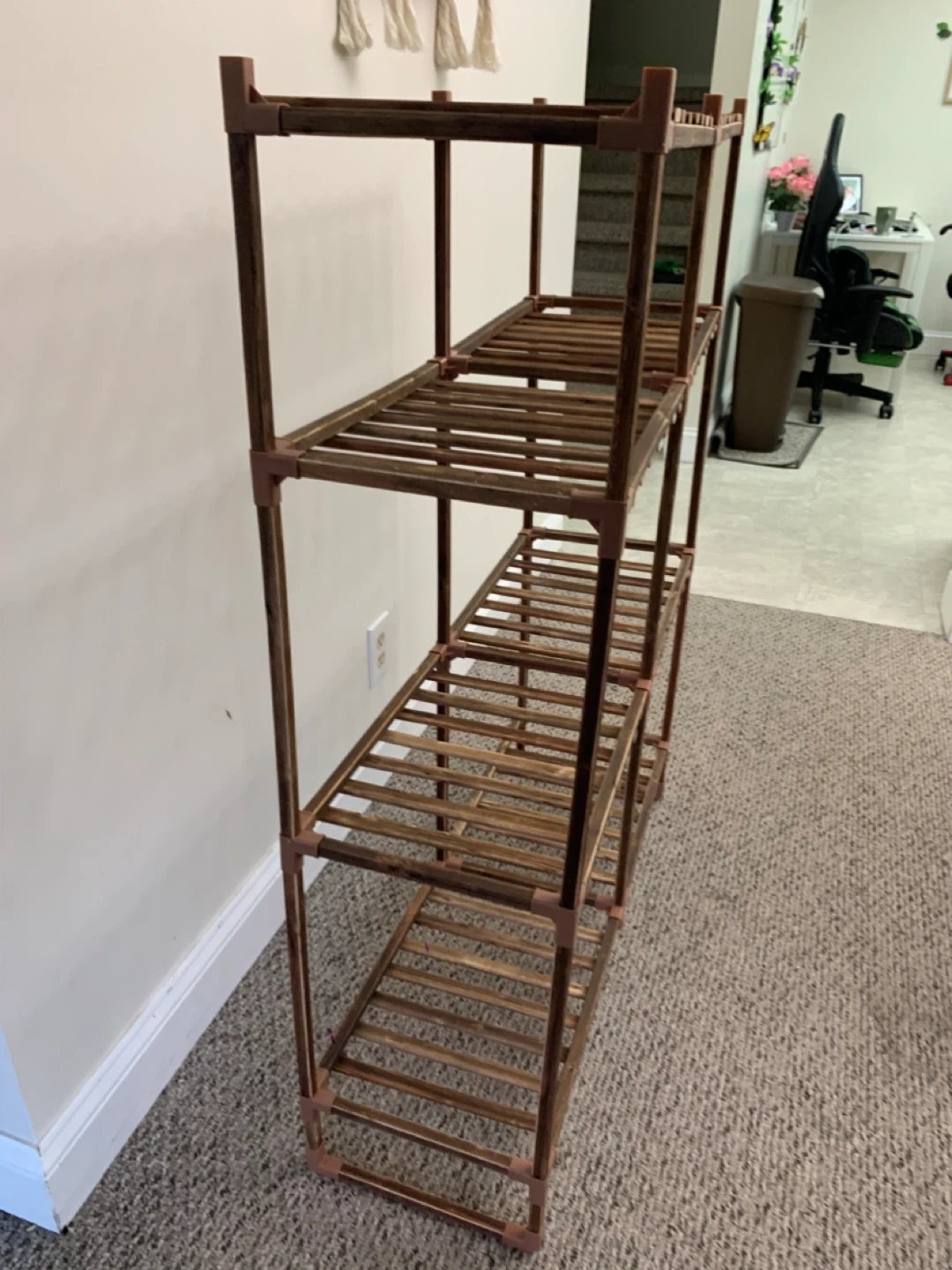 Four-tier wooden storage shelve or shoe rack in great condition! Perfect for keeping your entryway or closet organized. It's sturdy and easy to assemble, and the wood finish adds a nice touch to any room