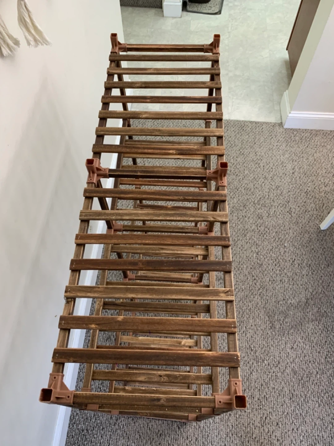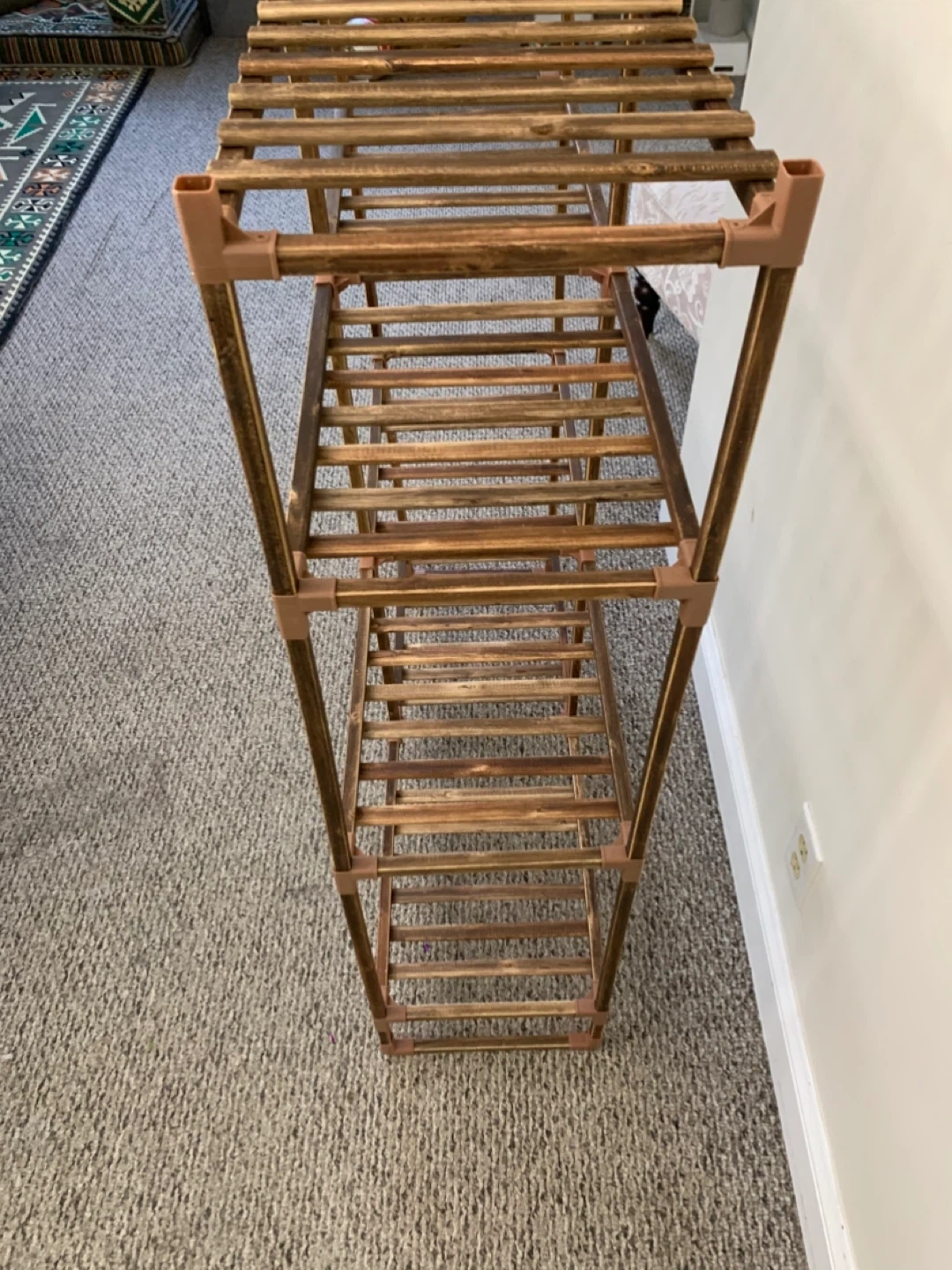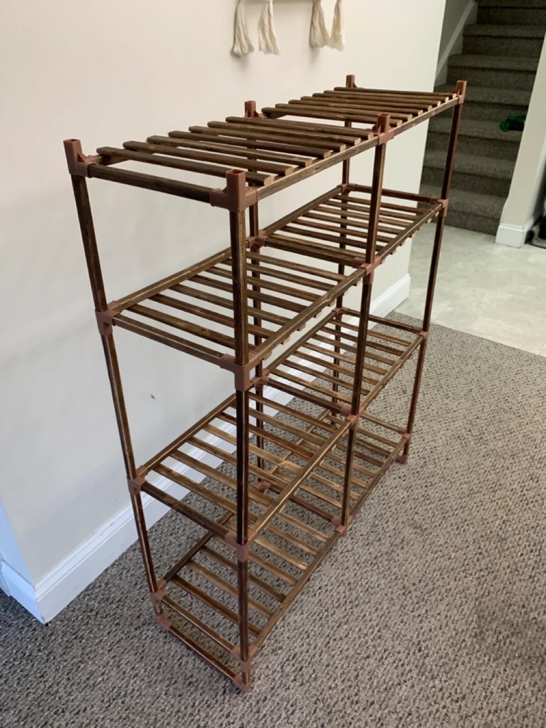 Four-tier wooden storage shelve or shoe rack in great condition! Perfect for keeping your entryway or closet organized. It's sturdy and easy to assemble, and the wood finish adds a nice touch to any room
