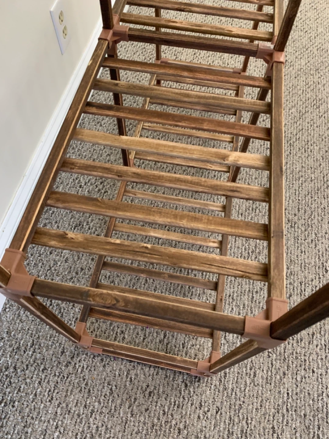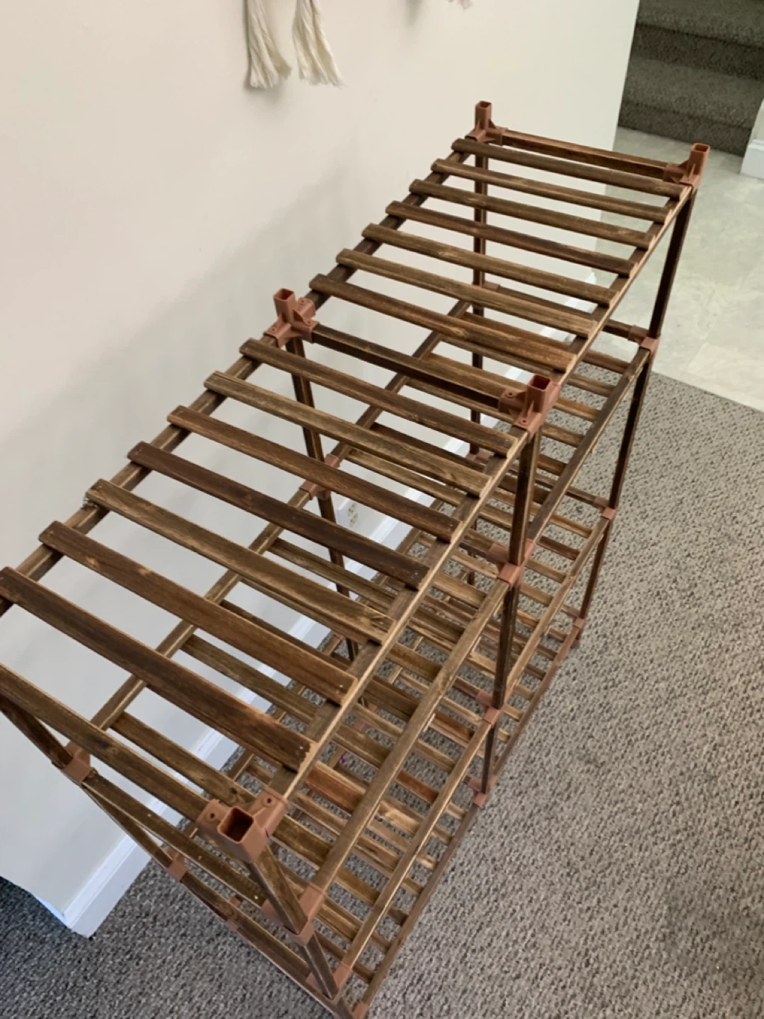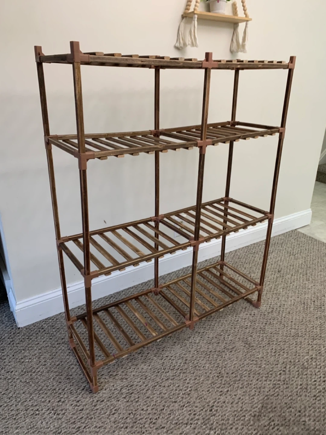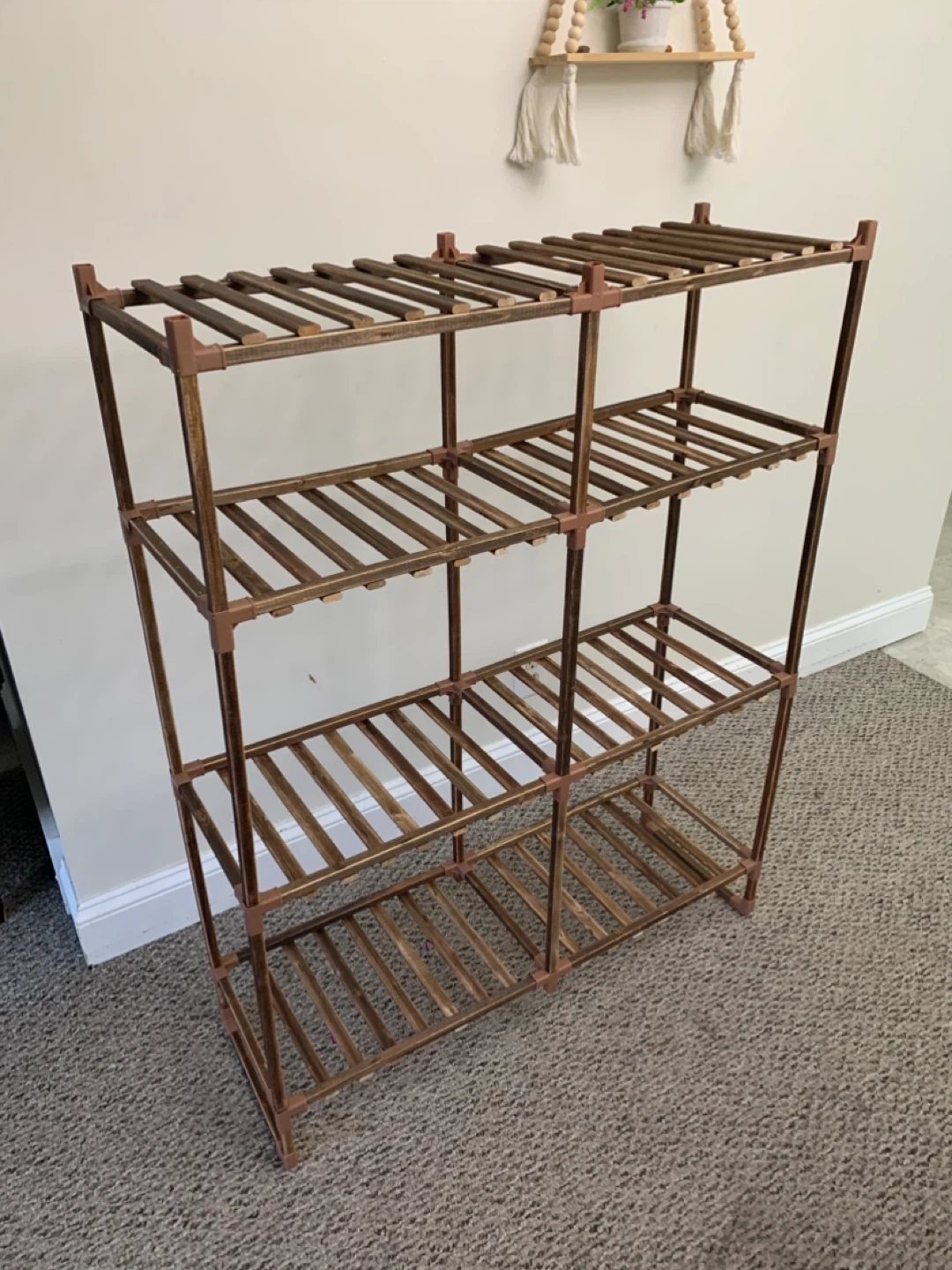 Four-tier wooden storage shelve or shoe rack in great condition! Perfect for keeping your entryway or closet organized. It's sturdy and easy to assemble, and the wood finish adds a nice touch to any room
