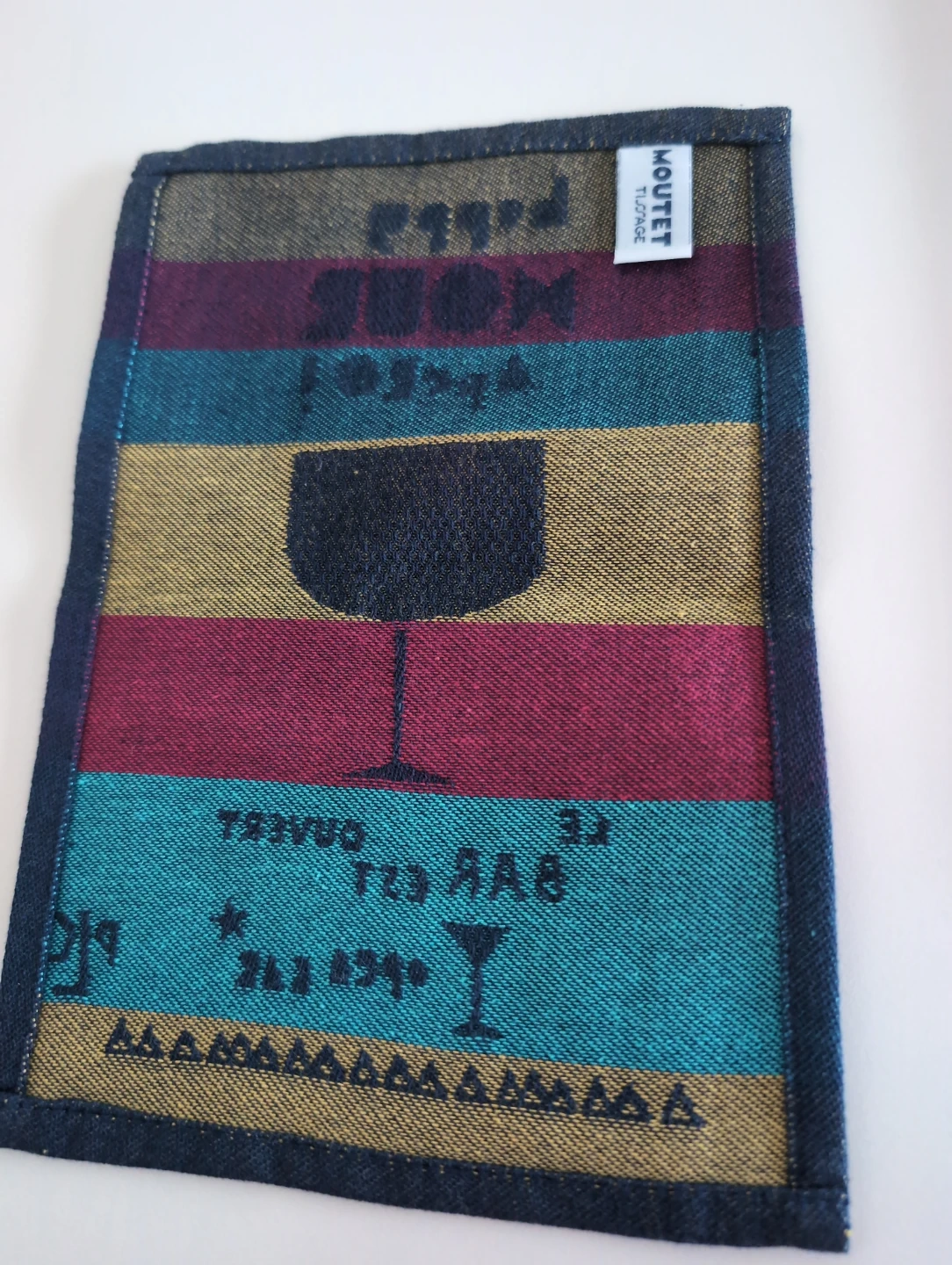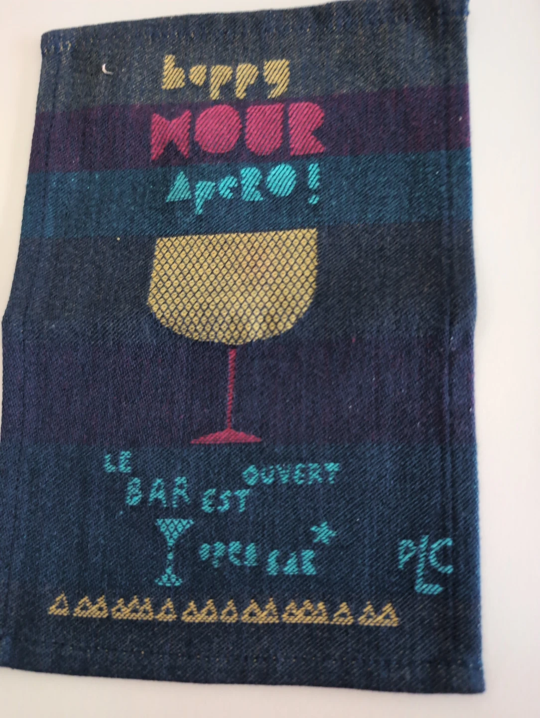 This is a Moutet Torchon bar towel with a fun 'Happy Hour' design! It features colourful stripes and a wine glass illustration. Perfect for adding a touch of whimsy to your home bar or kitchen