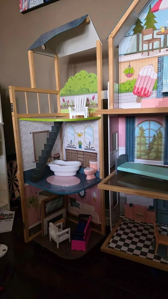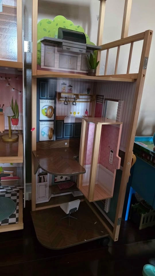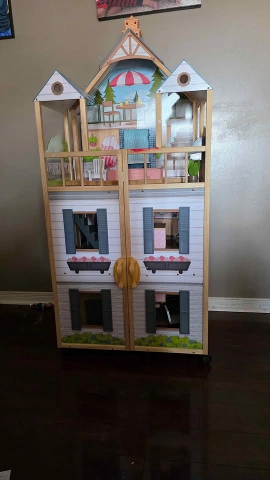 Dollhouse from Costco a year ago. Doors shut and open. Also on wheels so easy to move around. Waterfall lights up and makes sounds, and the fireplace crackles. Smoke-free home.