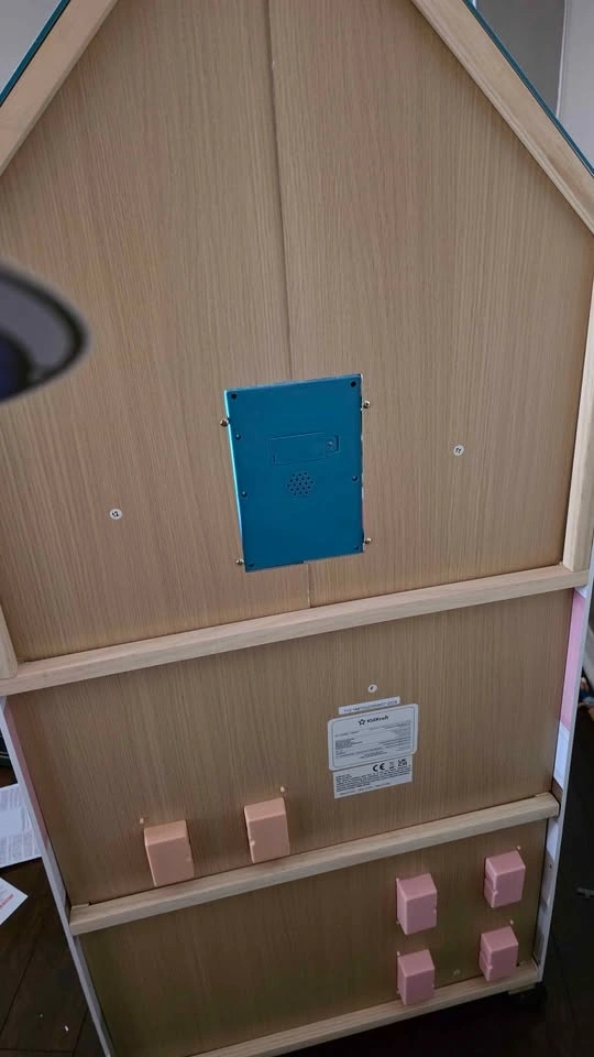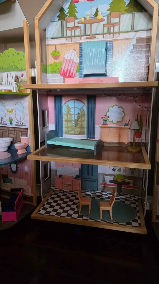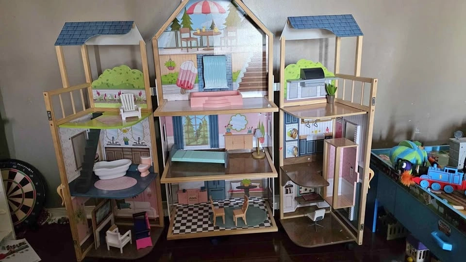 Dollhouse from Costco a year ago. Doors shut and open. Also on wheels so easy to move around. Waterfall lights up and makes sounds, and the fireplace crackles. Smoke-free home.