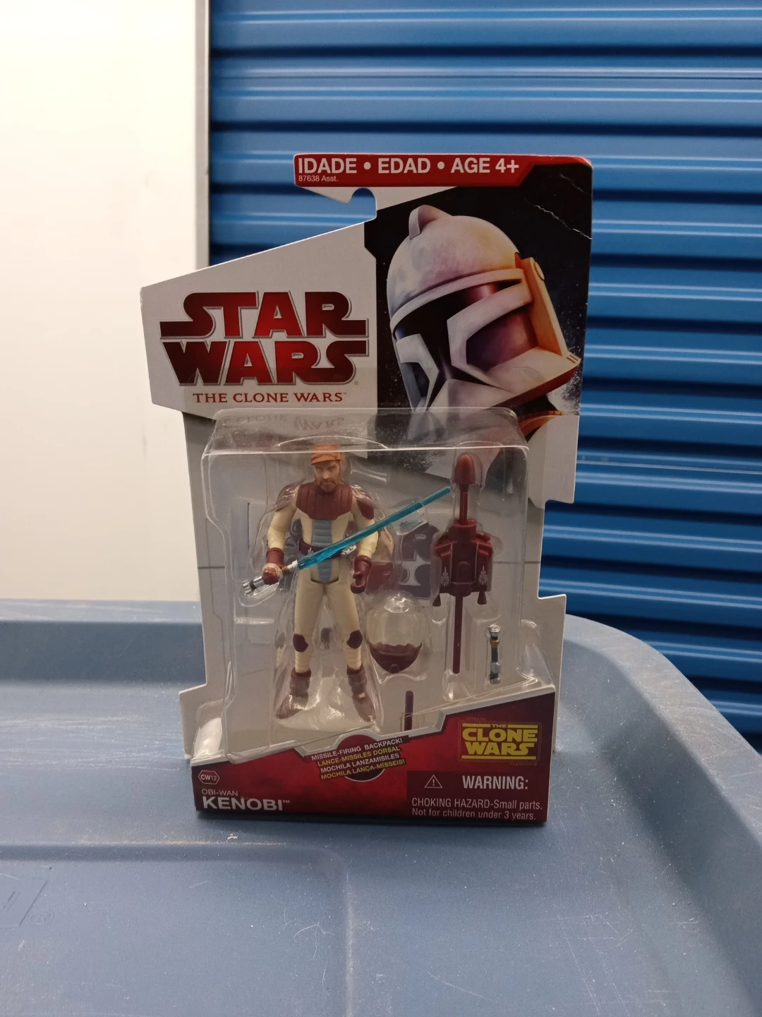 Selling a Star Wars The Clone Wars Obi-Wan Kenobi action figure. 4 and up. It includes a missile-firing backpack. Please be aware of the choking hazard warning for small parts; it's not suitable for children under 3 years. 2009