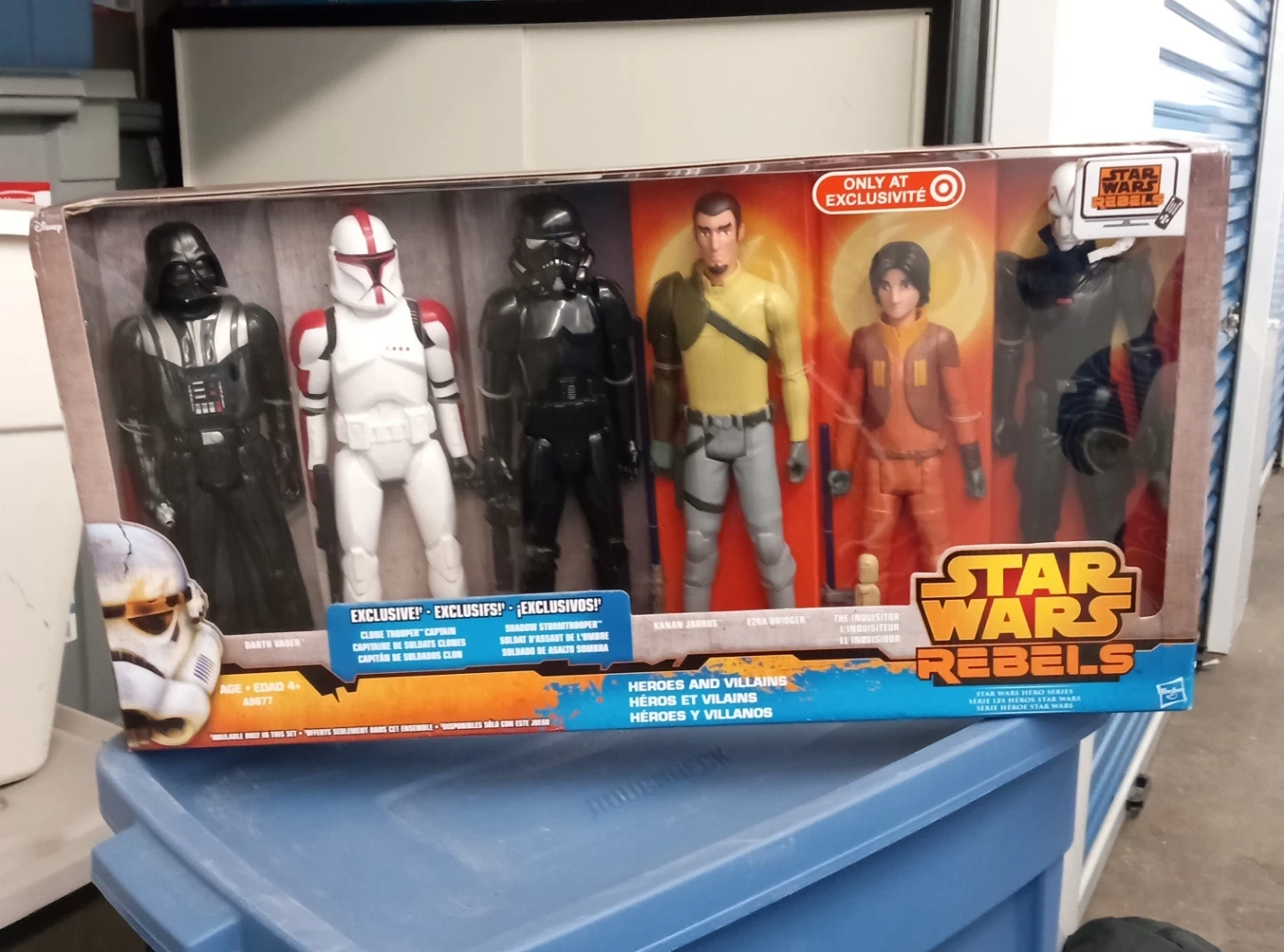 This is a Star Wars Rebels Heroes and Villains action figure set. It features Darth Vader, Clone Trooper Captain, Shadow Stormtrooper, Kanan Jarrus, Ezra Bridger, and The Inquisitor. The set is exclusive to Target. 2014