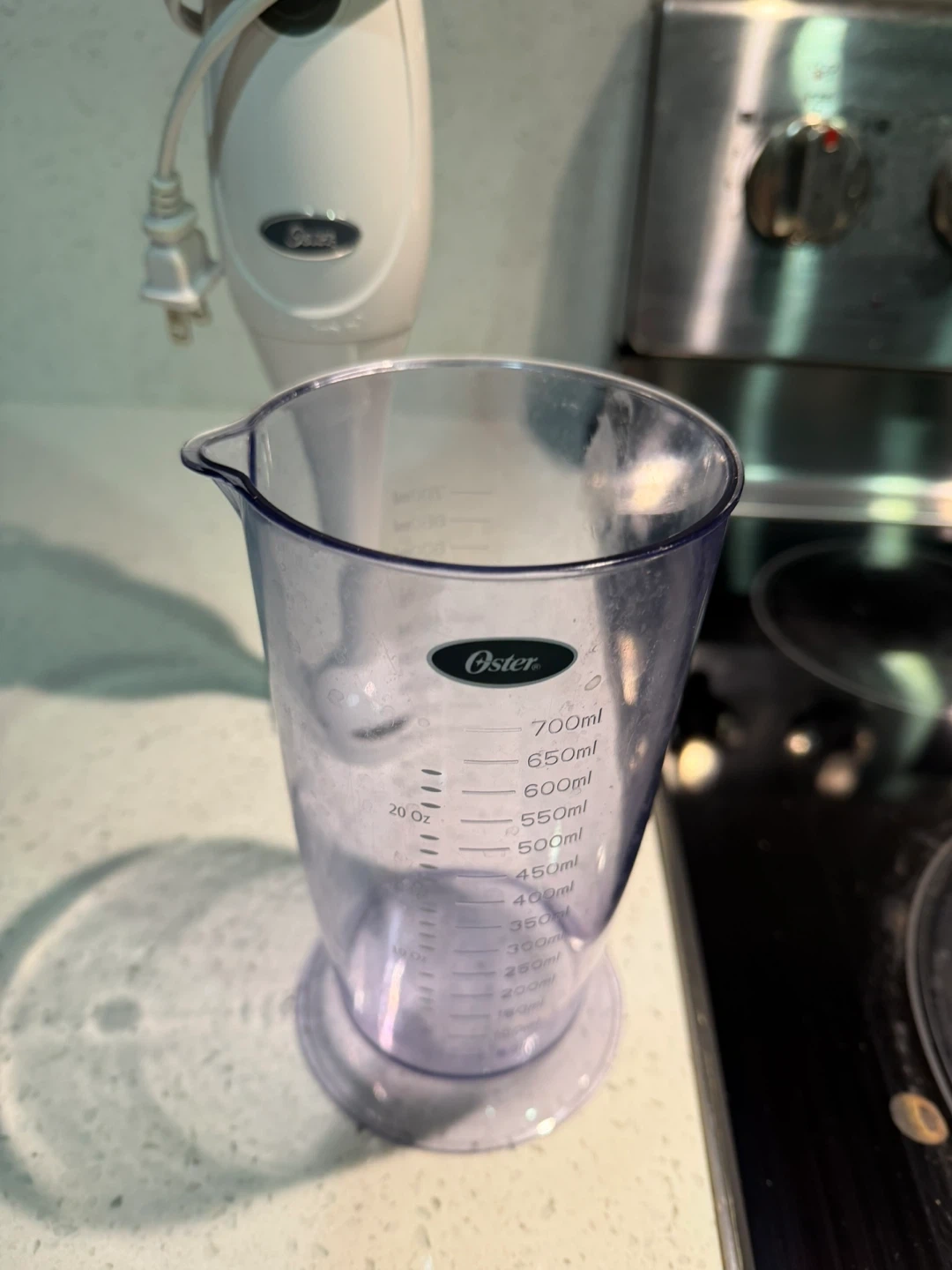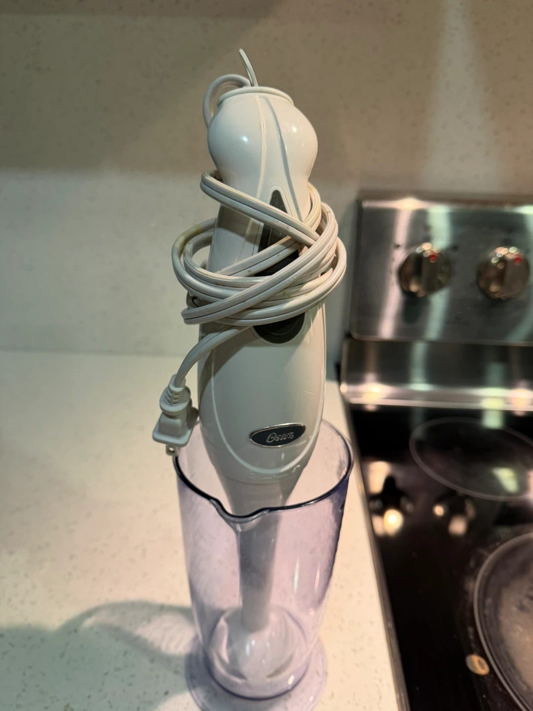Selling an Oster hand immersion blender! It comes with a handy measuring cup. Perfect for making smoothies, soups, or sauces right in your kitchen. It's in great condition and ready to use