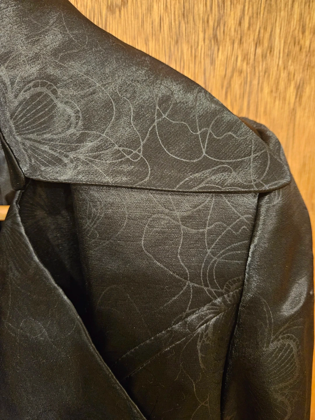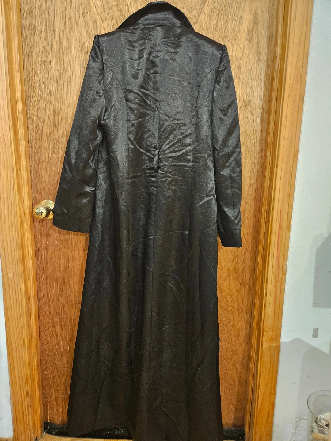Selling a stylish Shefoun trench coat in black. It's made of 100% polyester and is a size 40. The coat has a classic design with a belt and button details. Perfect for adding a touch of elegance to your wardrobe!. The coat is 54 inches long. One off the front belt hops needs to be stich back (picture included).