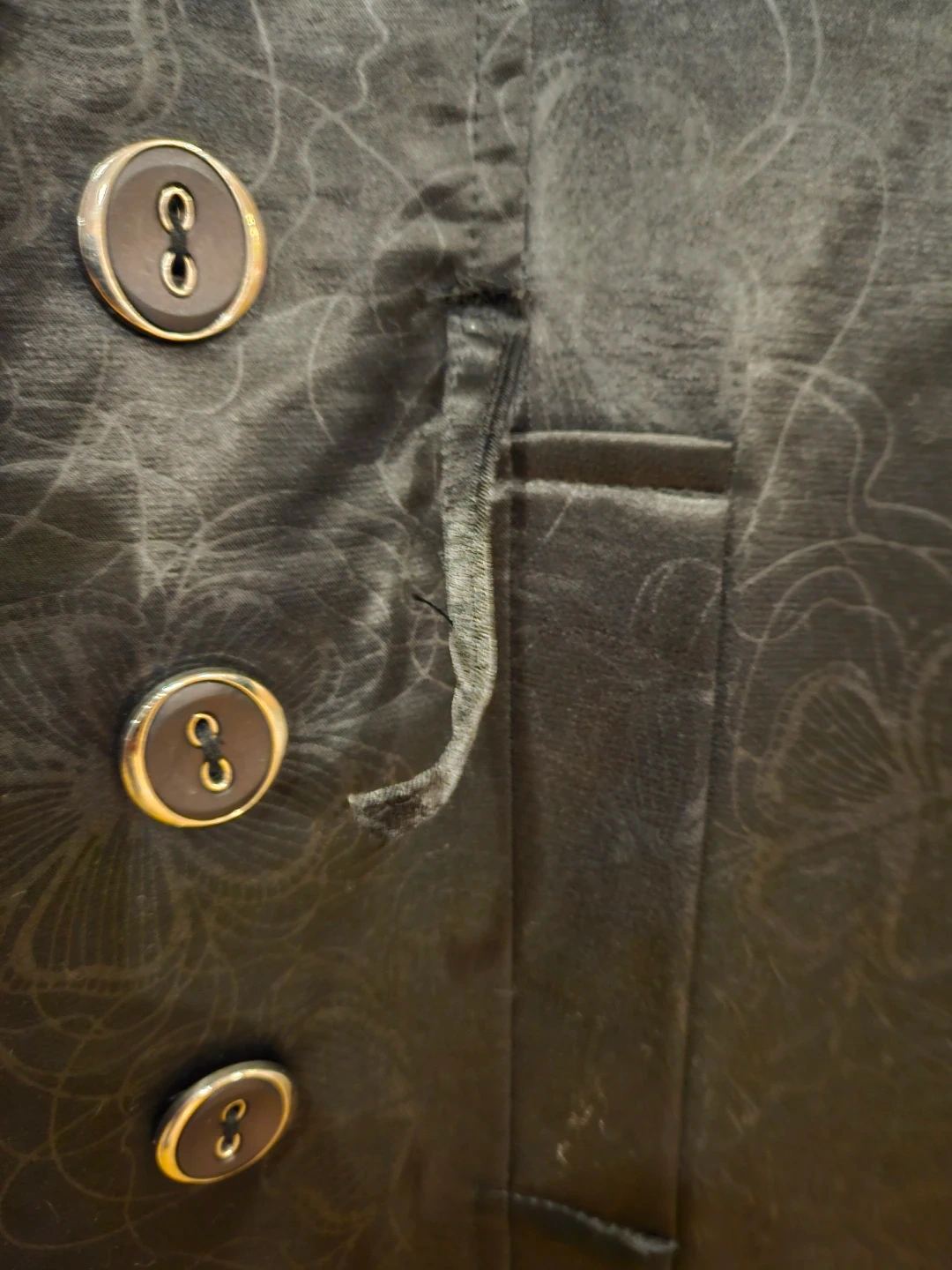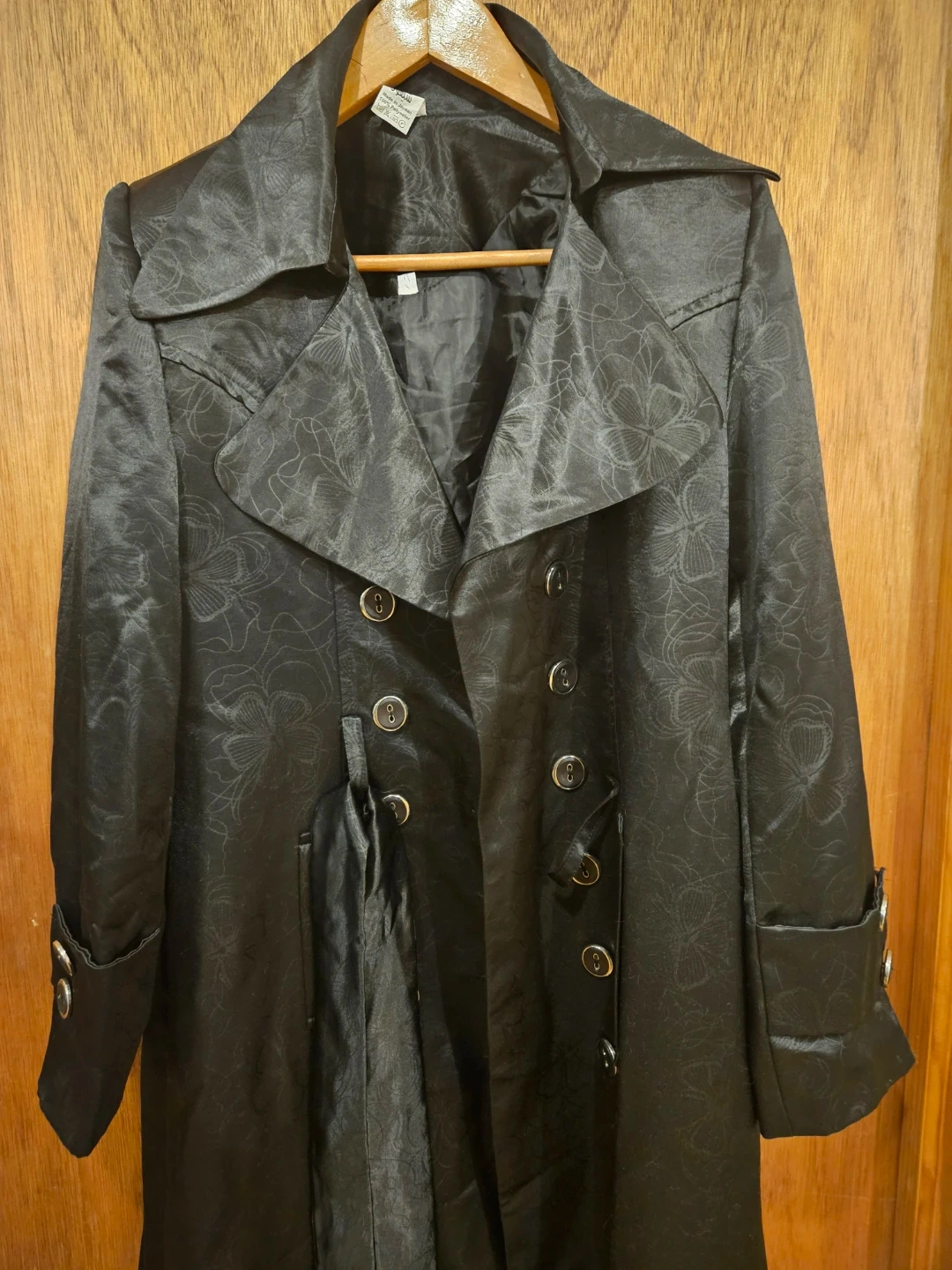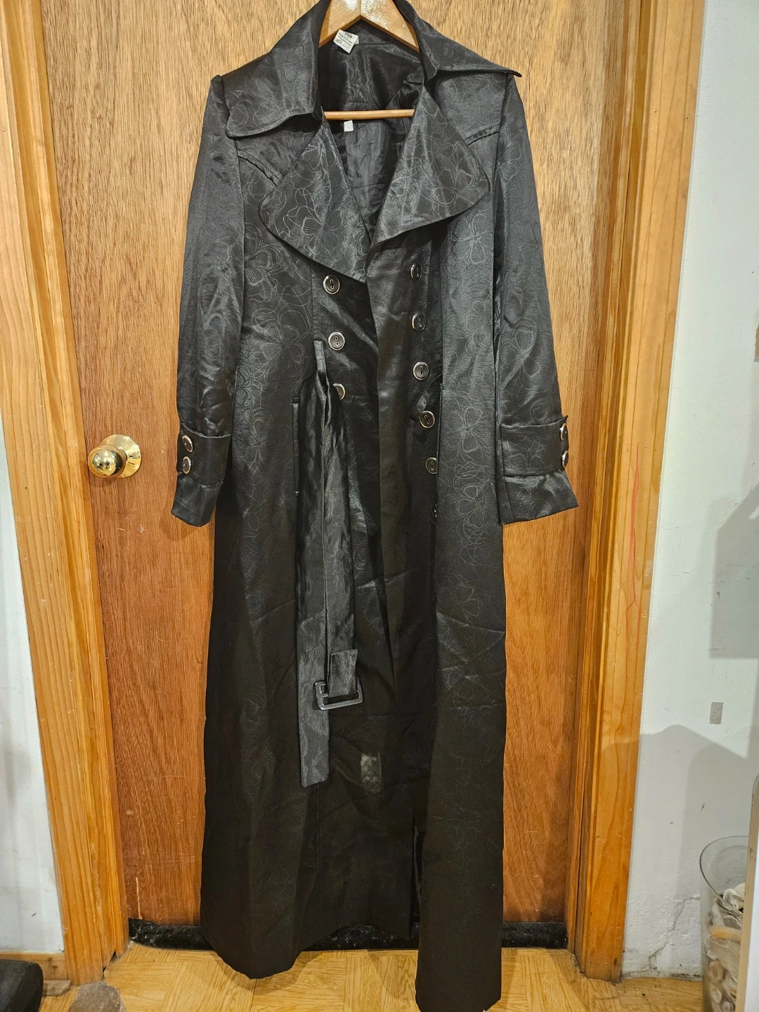 Selling a stylish Shefoun trench coat in black. It's made of 100% polyester and is a size 40. The coat has a classic design with a belt and button details. Perfect for adding a touch of elegance to your wardrobe!. The coat is 54 inches long. One off the front belt hops needs to be stich back (picture included).