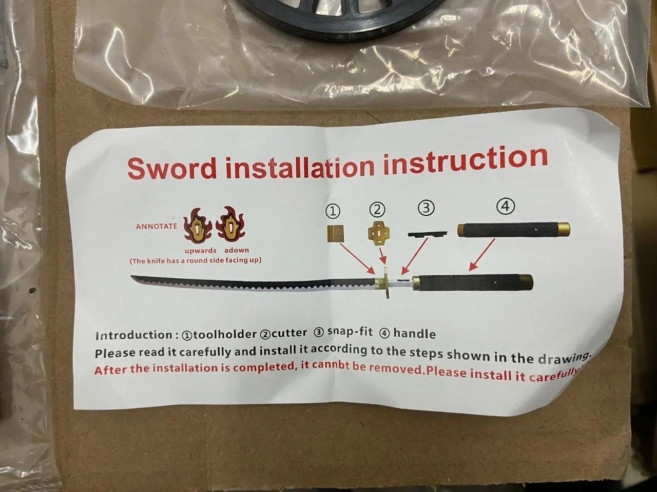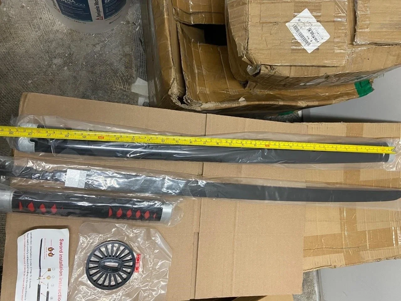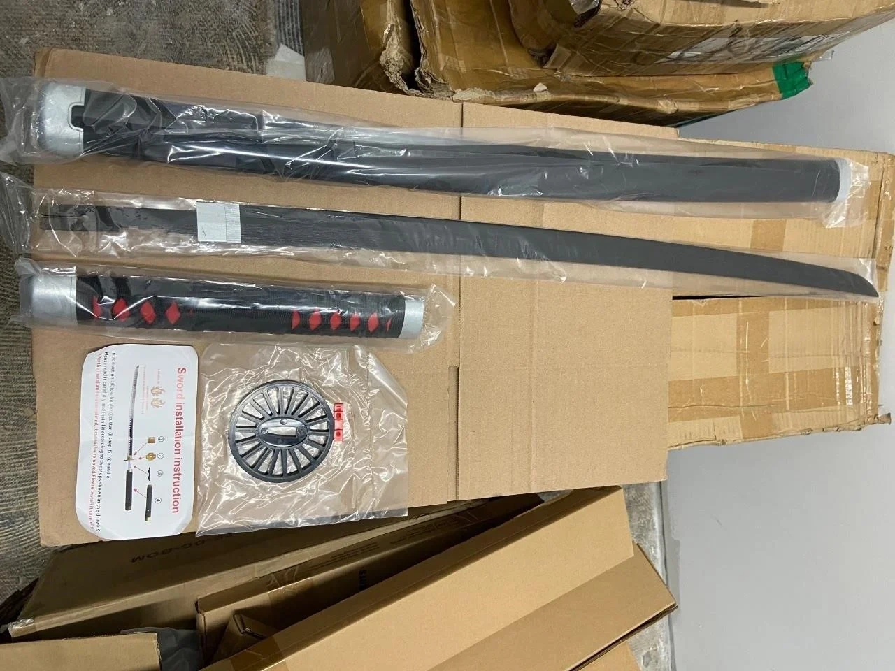 Selling a decorative katana sword. It comes with the scabbard and installation instructions. The handle is black with red accents, and the blade is black as well. Great for display or cosplay!