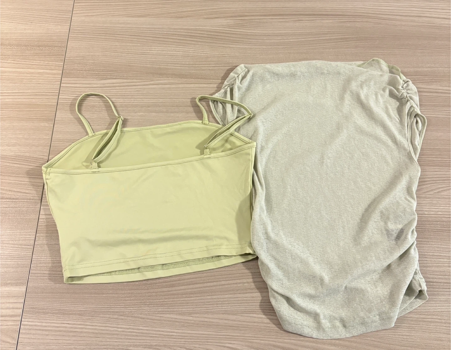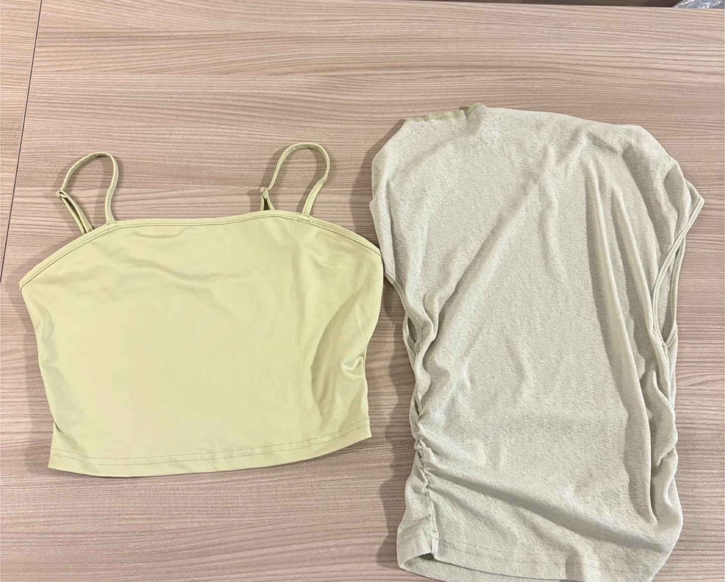 Selling a set of two cute tops! One is an asymmetrical neck ruched top and the other is a solid cami top. Both are in great condition and ready for a new home. They're a stylish addition to any wardrobe!