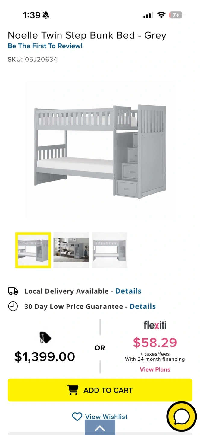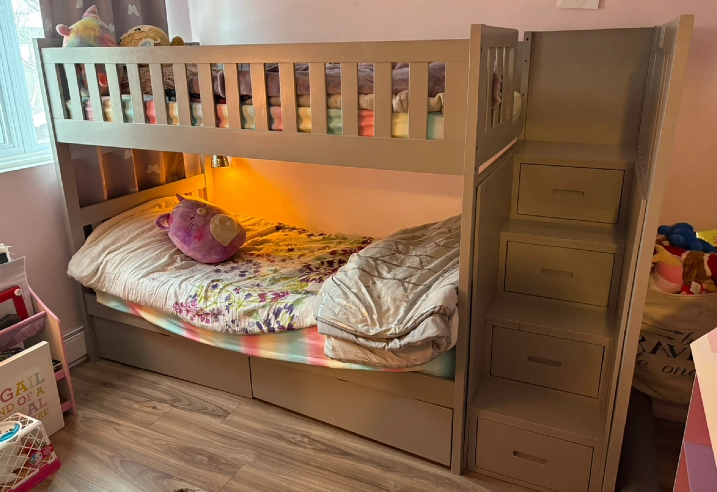 Selling a Noelle Twin Step Bunk Bed in grey! It features a twin-sized bunk bed with built-in steps and storage drawers. It's a great space-saving solution for kids' rooms.