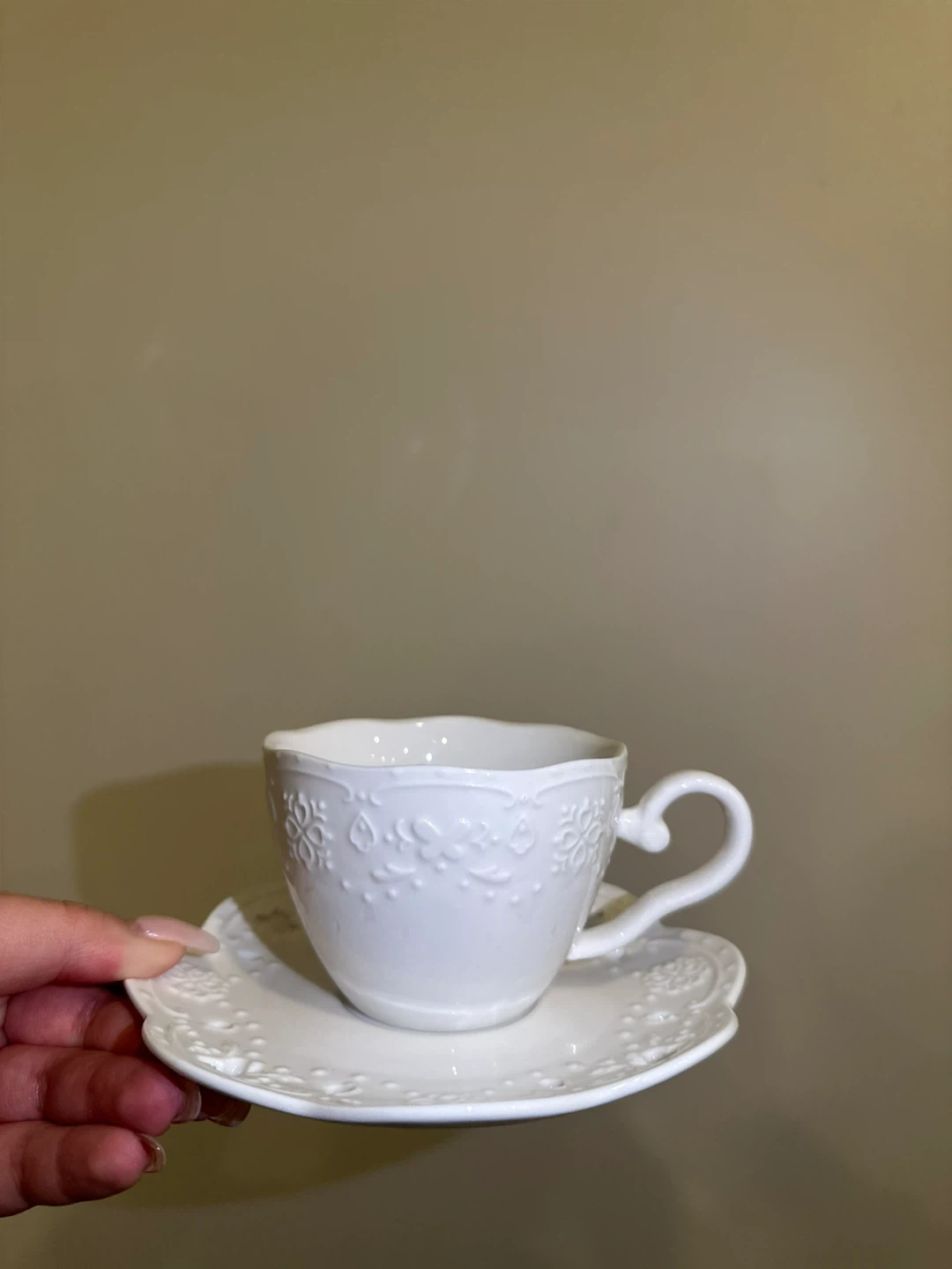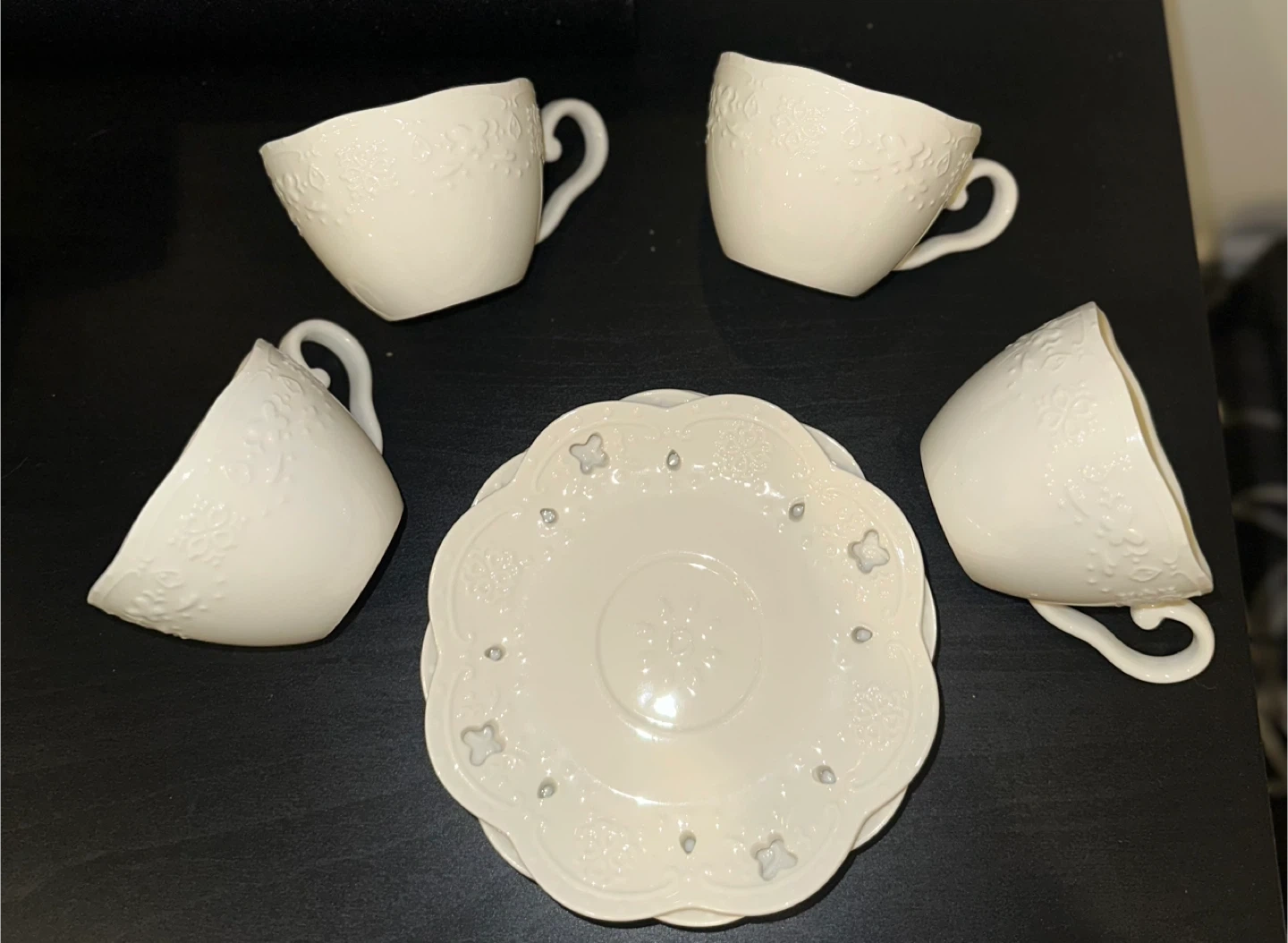 Selling a set of four elegant tea cups with a matching saucer. The cups and saucer feature a delicate embossed floral design 🌸✨