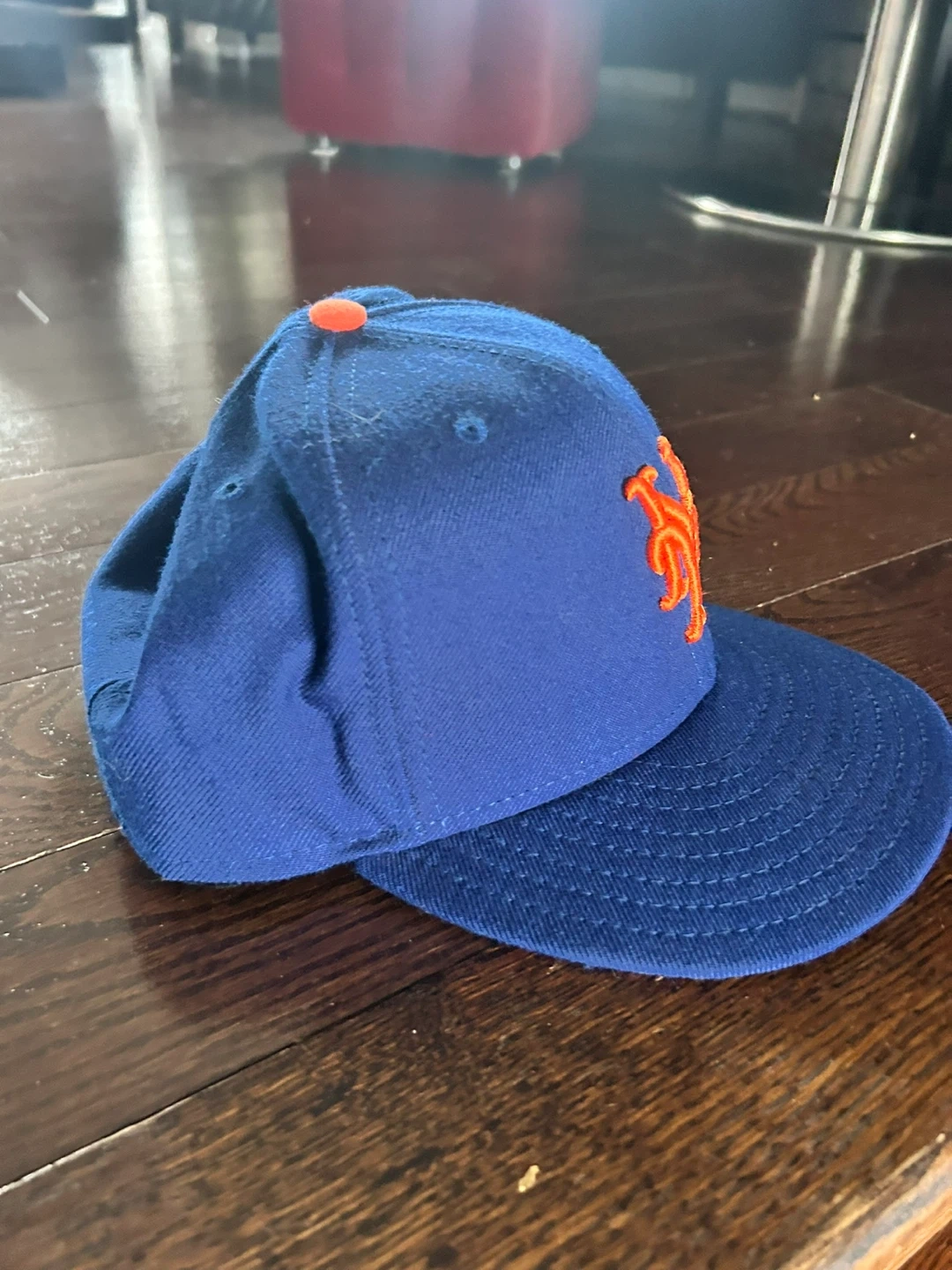 New Era New York Mets fitted baseball cap. It's a blue hat with the orange 'NY' logo and an orange button on top. The size is 7 1/2, which is 59.6cm. This cap is perfect for any Mets fan! Worn a few times
