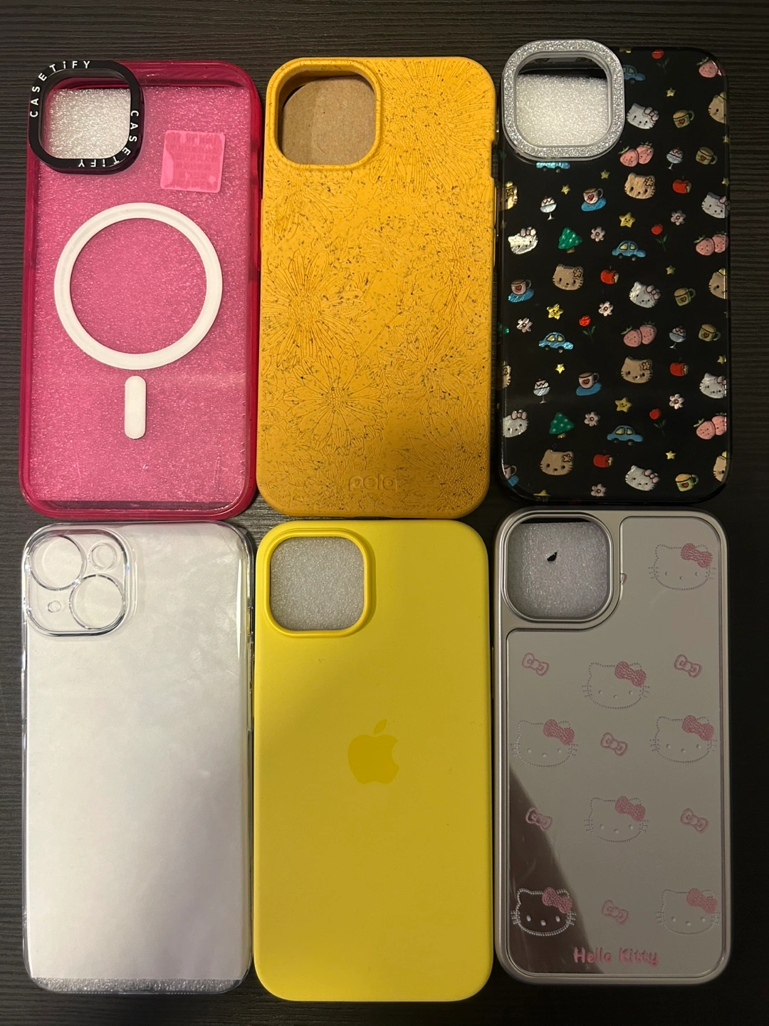 Selling a variety of iPhone cases! There's a Casetify case with MagSafe, a yellow Pela case with a floral design, an Apple yellow silicone case, and a Hello Kitty case.