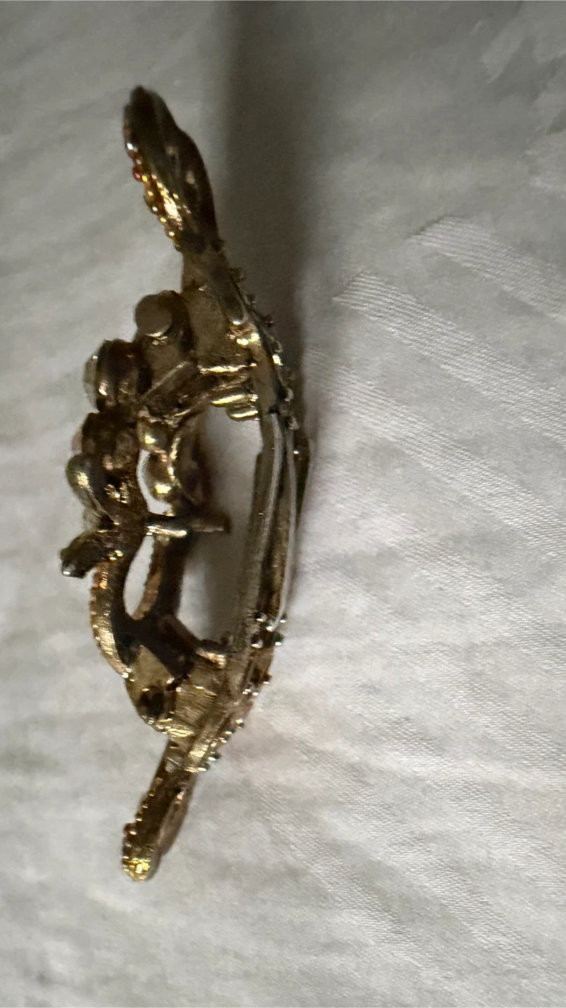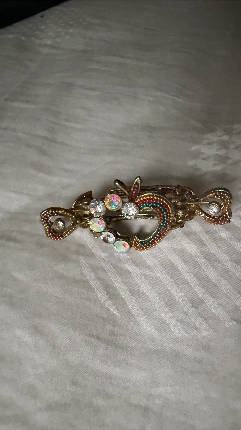 Selling a lovely vintage gold-tone hair clip! It's adorned with colourful rhinestones and has a unique design. Perfect for adding a touch of sparkle to your hairstyle. Used only once