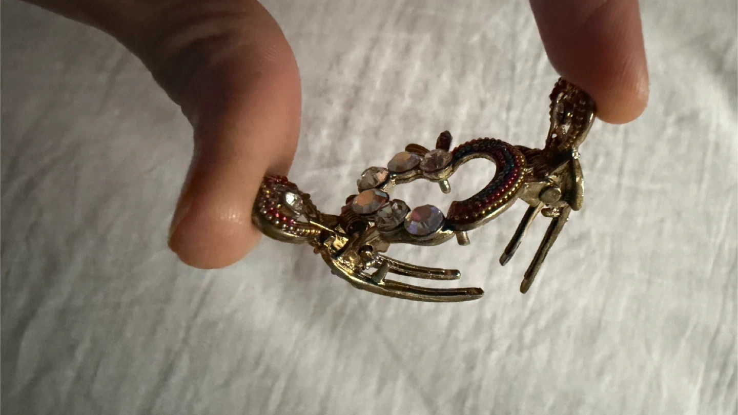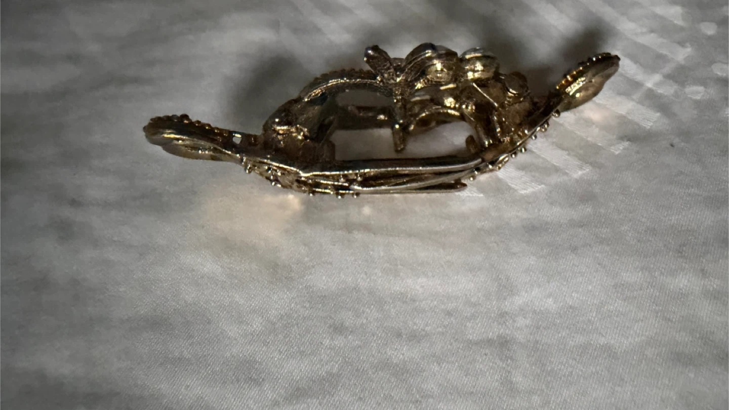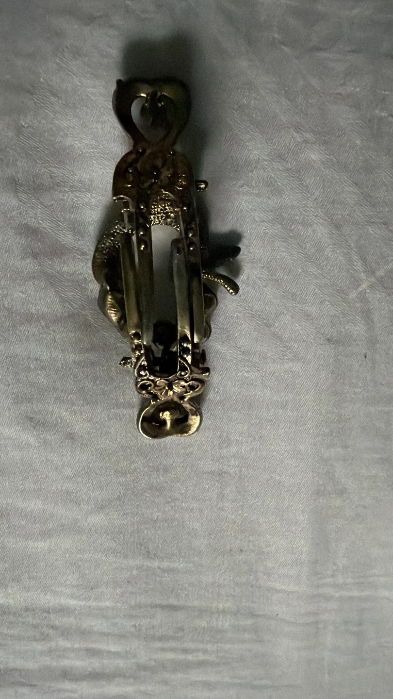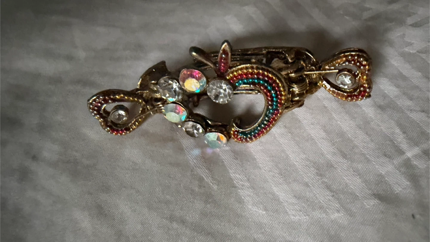 Selling a lovely vintage gold-tone hair clip! It's adorned with colourful rhinestones and has a unique design. Perfect for adding a touch of sparkle to your hairstyle. Used only once
