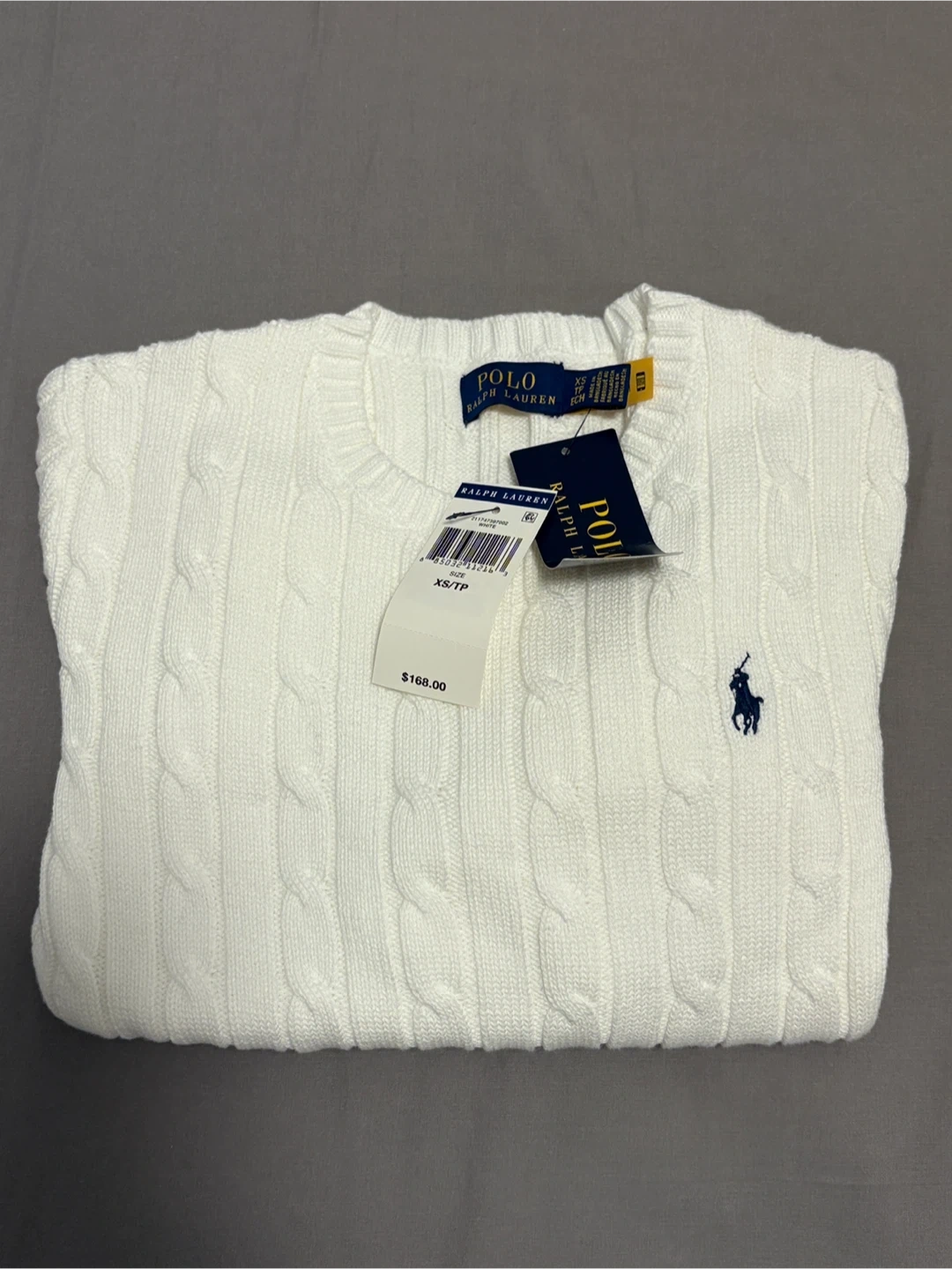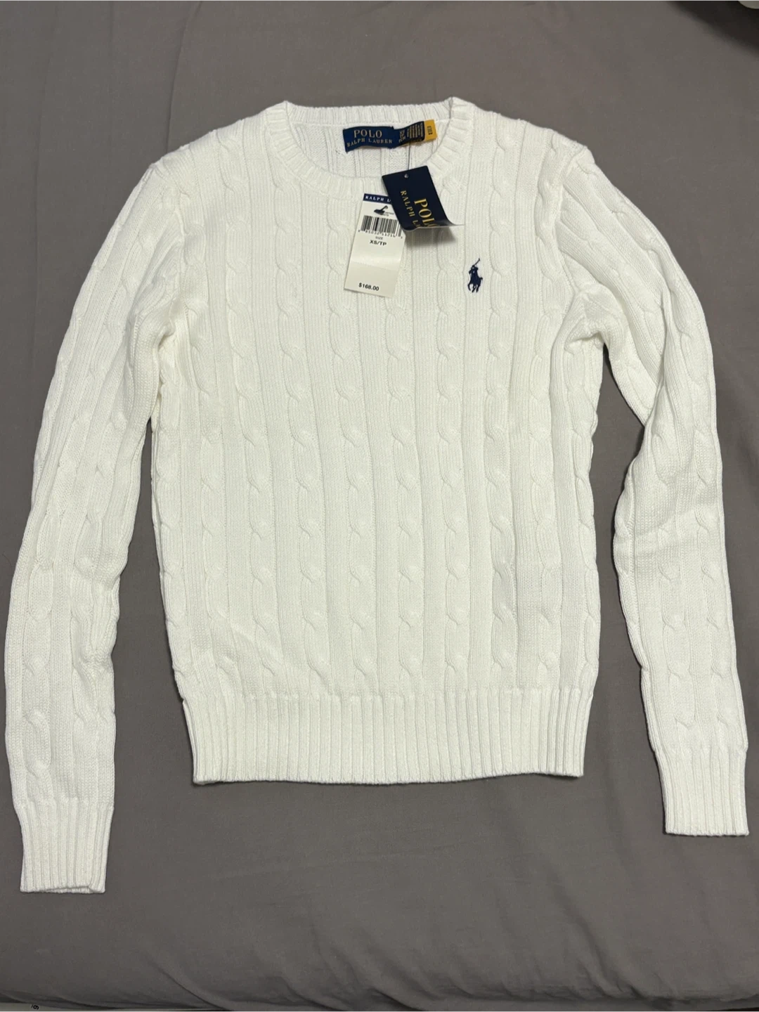 This is a brand new Polo Ralph Lauren cable knit sweater in size XS. It's a beautiful white colour and has the classic Polo logo. The tags are still attached and it retails for $168. It's made of soft material and would be a great addition to your wardrobe!
