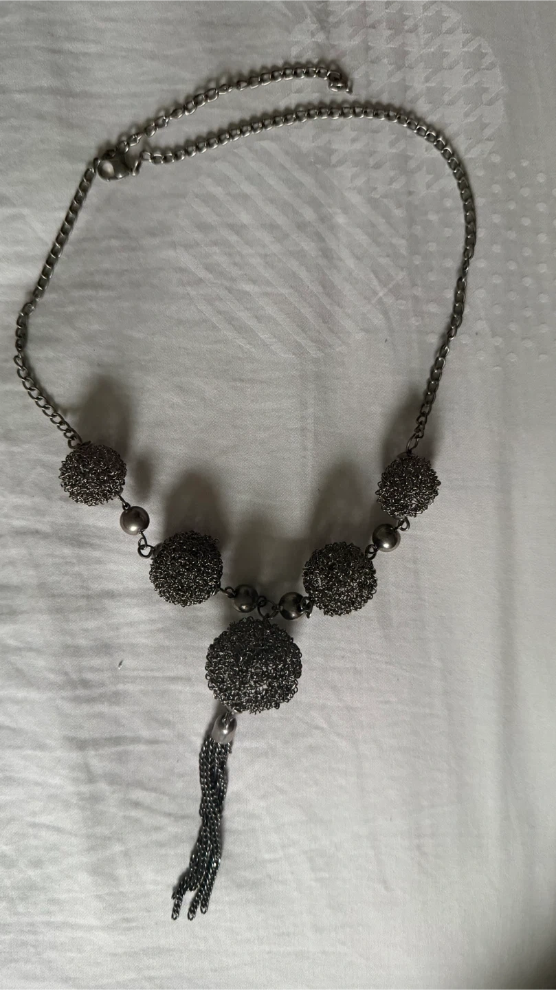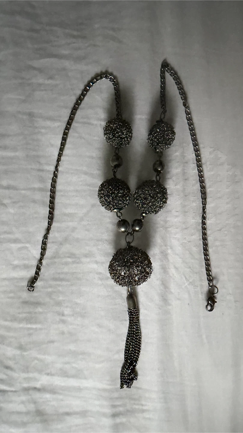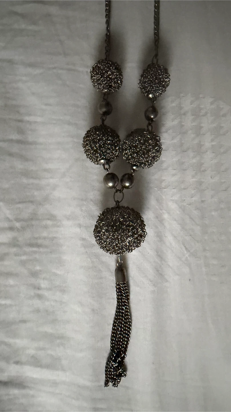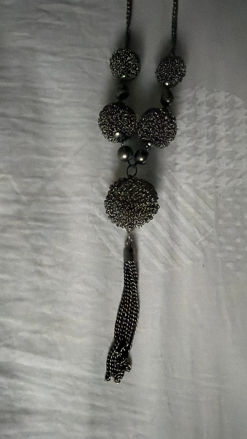 Here's a stylish black-tone necklace featuring a unique tassel design! It's in great condition and ready to add a touch of elegance to any outfit. The necklace has decorative beaded accents and a secure clasp closure. Perfect for dressing up or adding a bit of flair to your everyday look. Never used