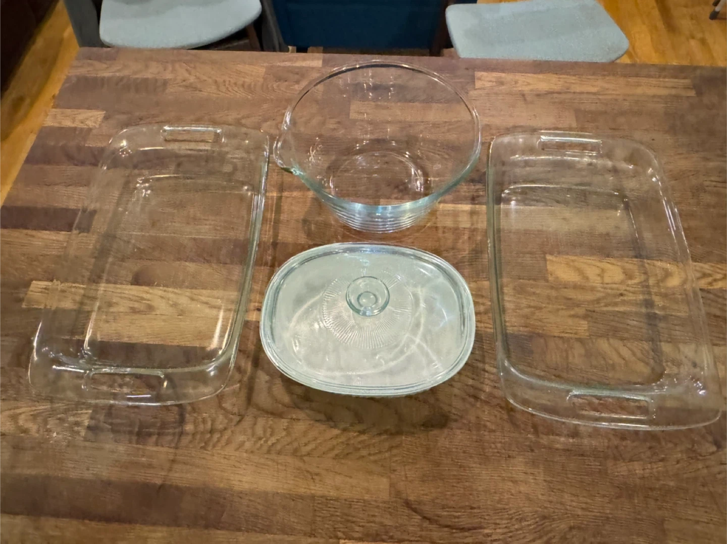 Selling a CorningWare and Pyrex glassware set! Included are two rectangular baking dishes, a mixing bowl, and a casserole dish with a lid. They're all in great condition and ready for a new home